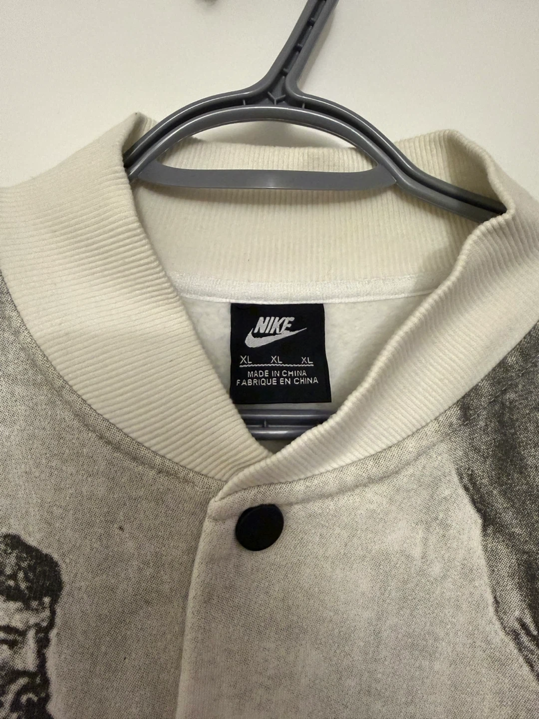 Unique Nike jacket featuring a Renaissance “Last Supper” style artwork printed across the entire piece. Very eye-catching design with snap button closure and ribbed collar.