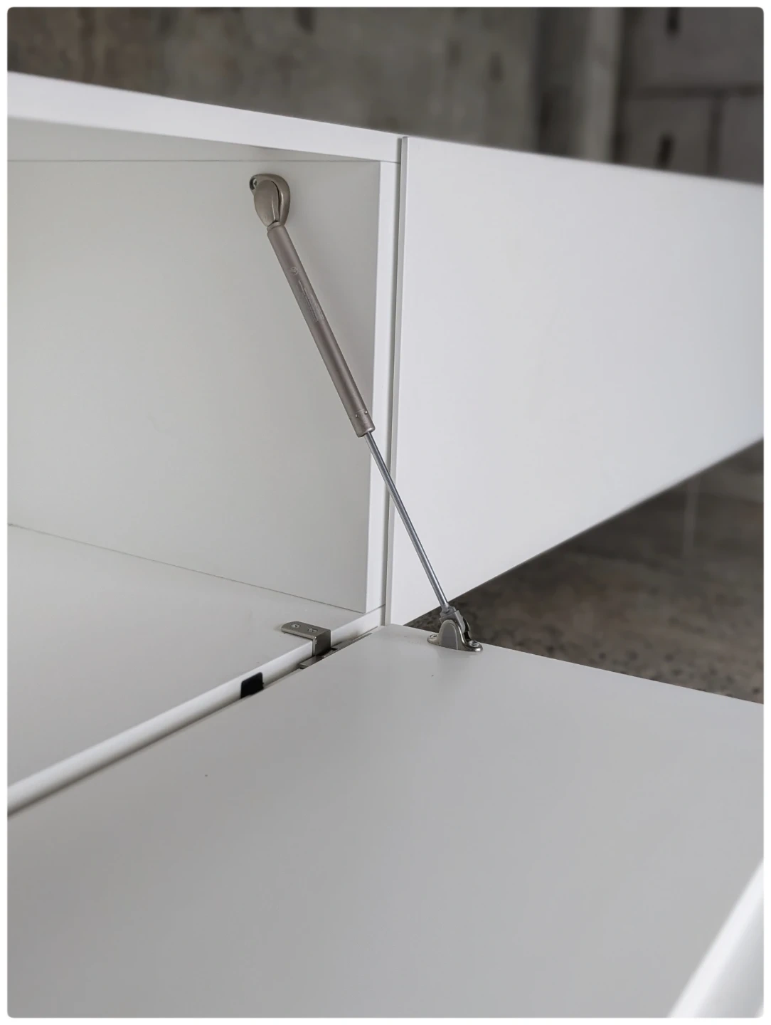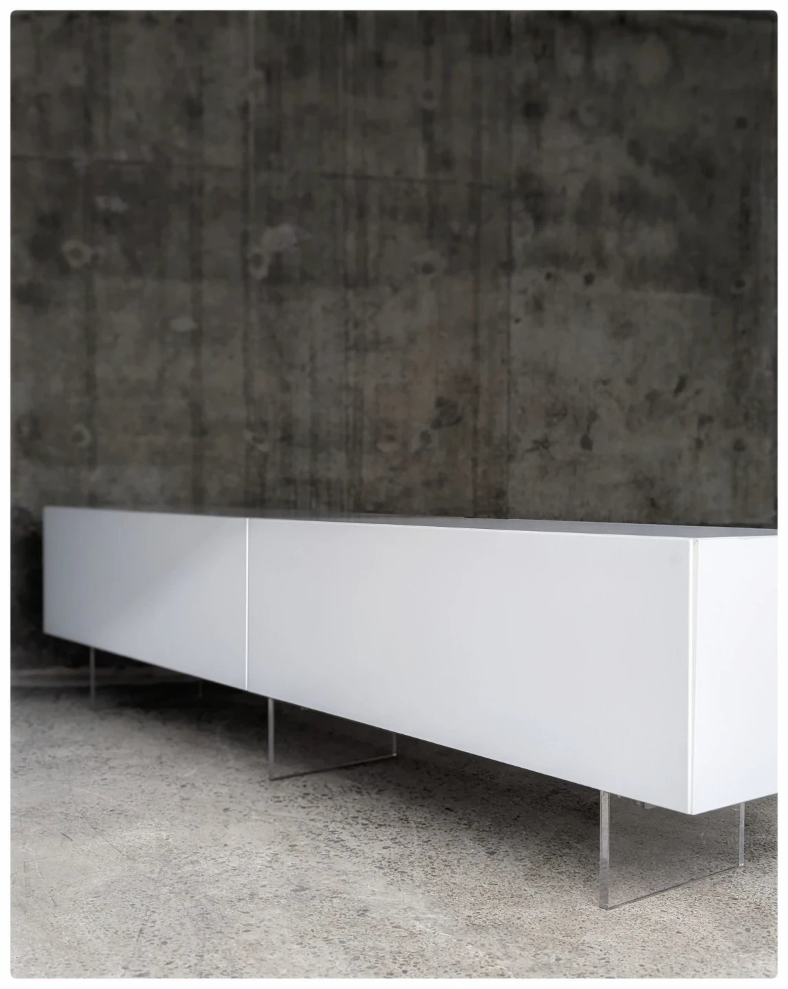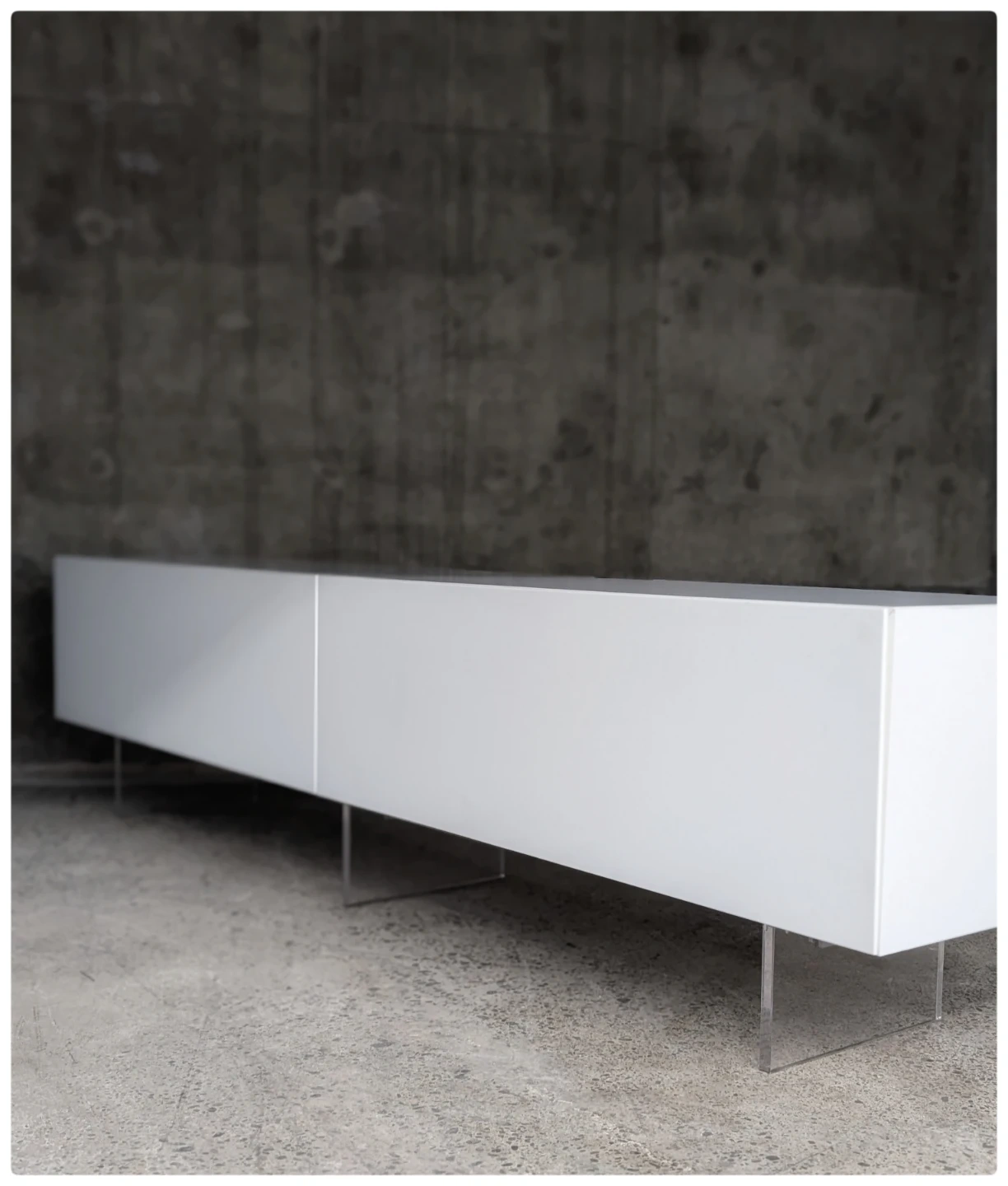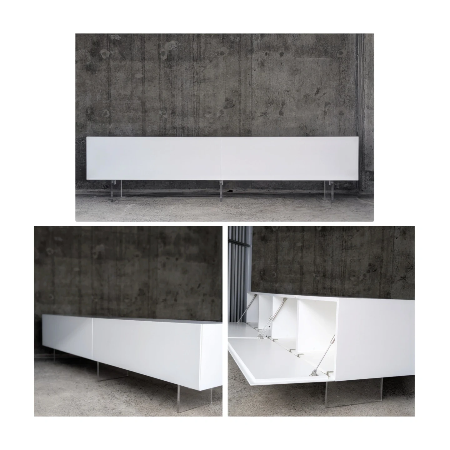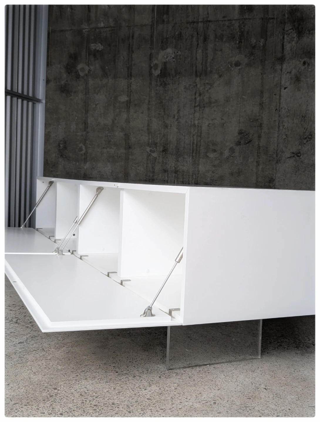 Futures plexiglass legs ,soft close doors , designated openings for wires and cables