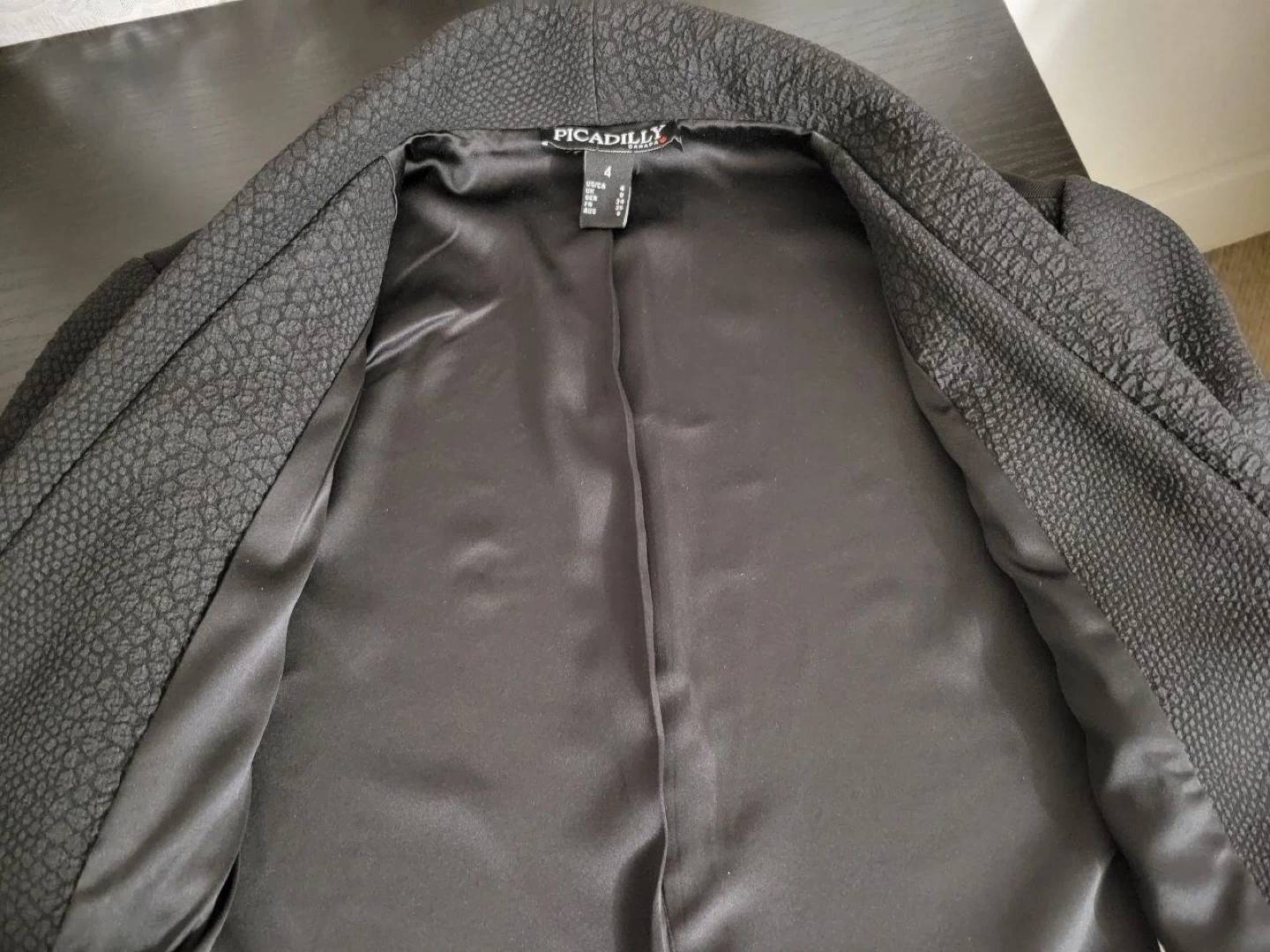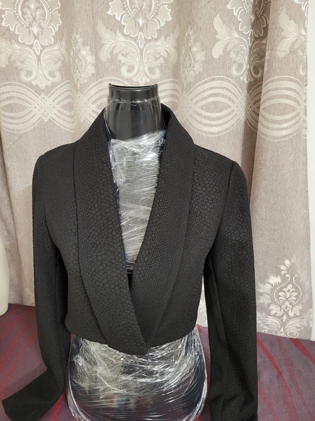The dress features a unique textured pattern and a flattering silhouette. The jacket complements the dress perfectly, making it a great outfit for any occasion!