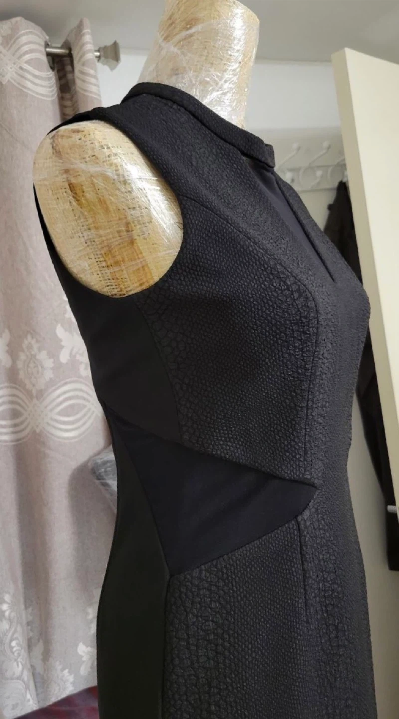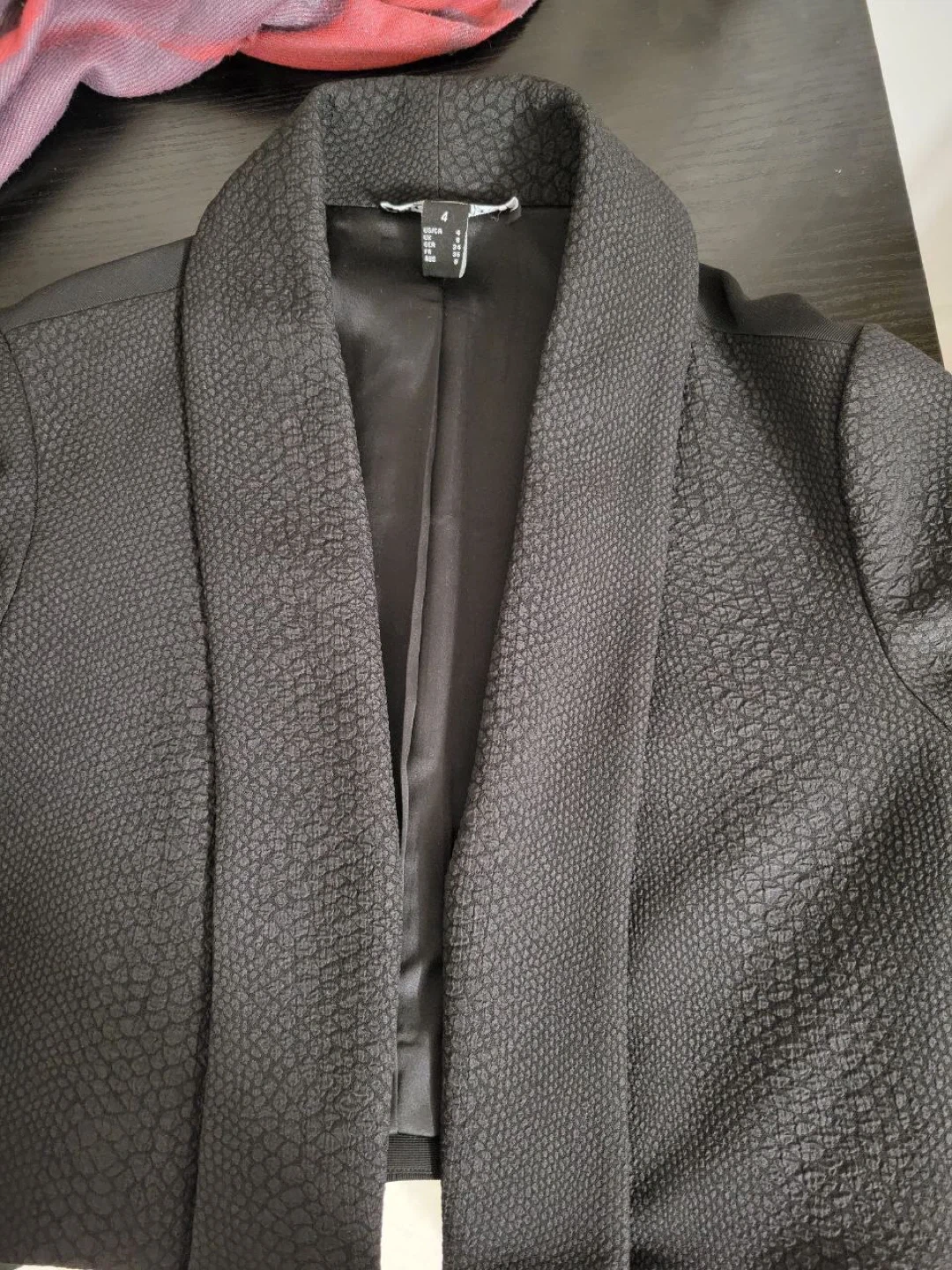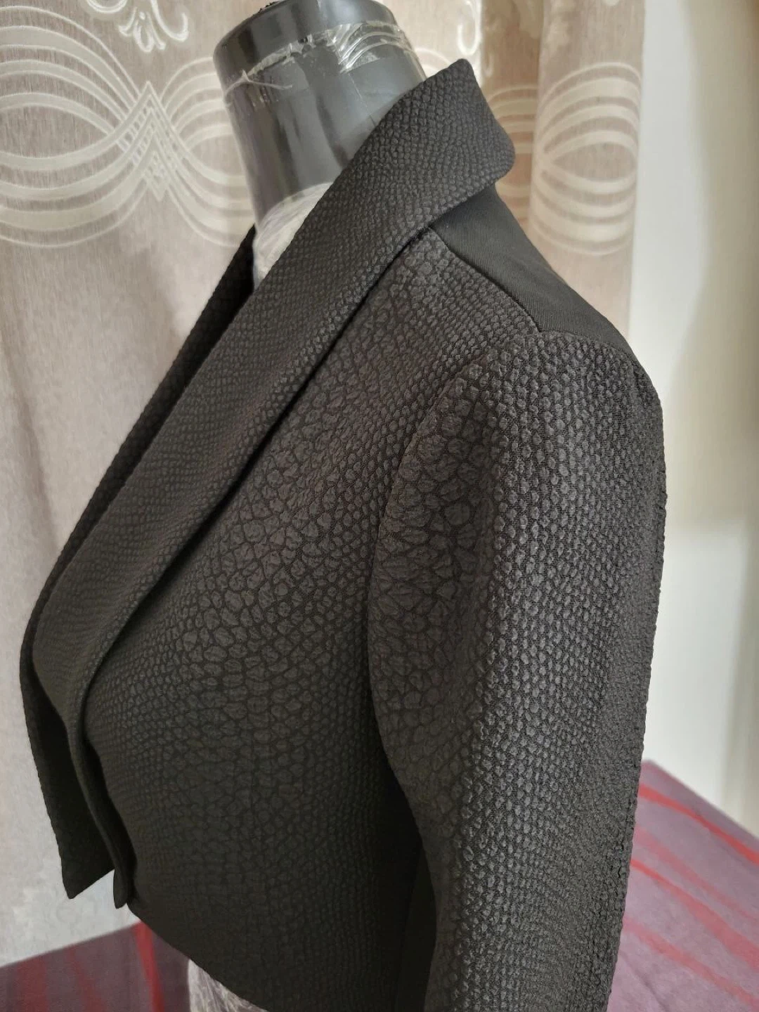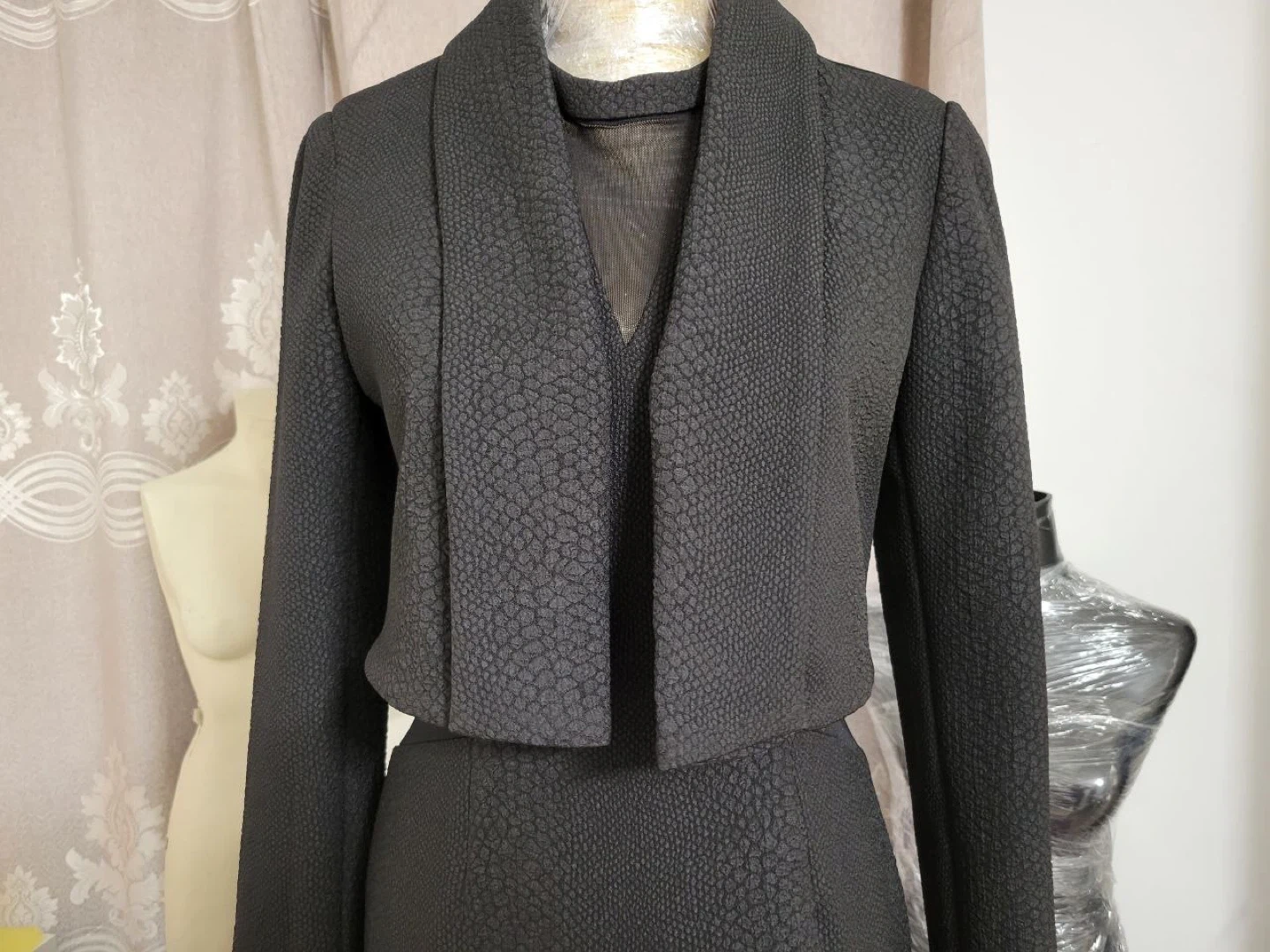 The dress features a unique textured pattern and a flattering silhouette. The jacket complements the dress perfectly, making it a great outfit for any occasion!