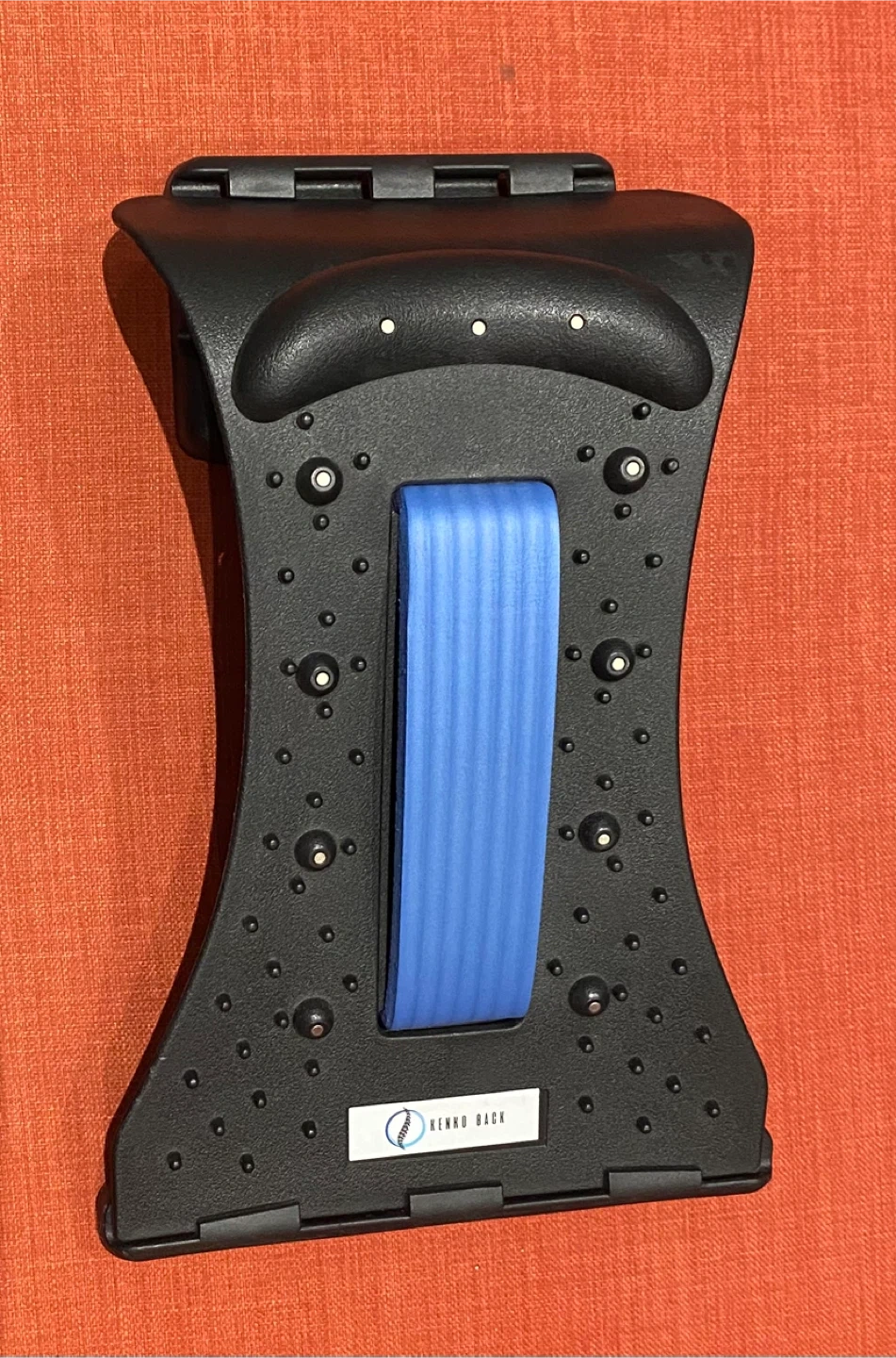 This is a Kenko neck stretcher device. It features a textured black plastic body with a blue padded roller. Several small massage nubs are integrated into the black plastic. Height adjustable. Helpful to relieve tension associated with headaches, migraines, etc. Pick up at Weston and Eglinton.