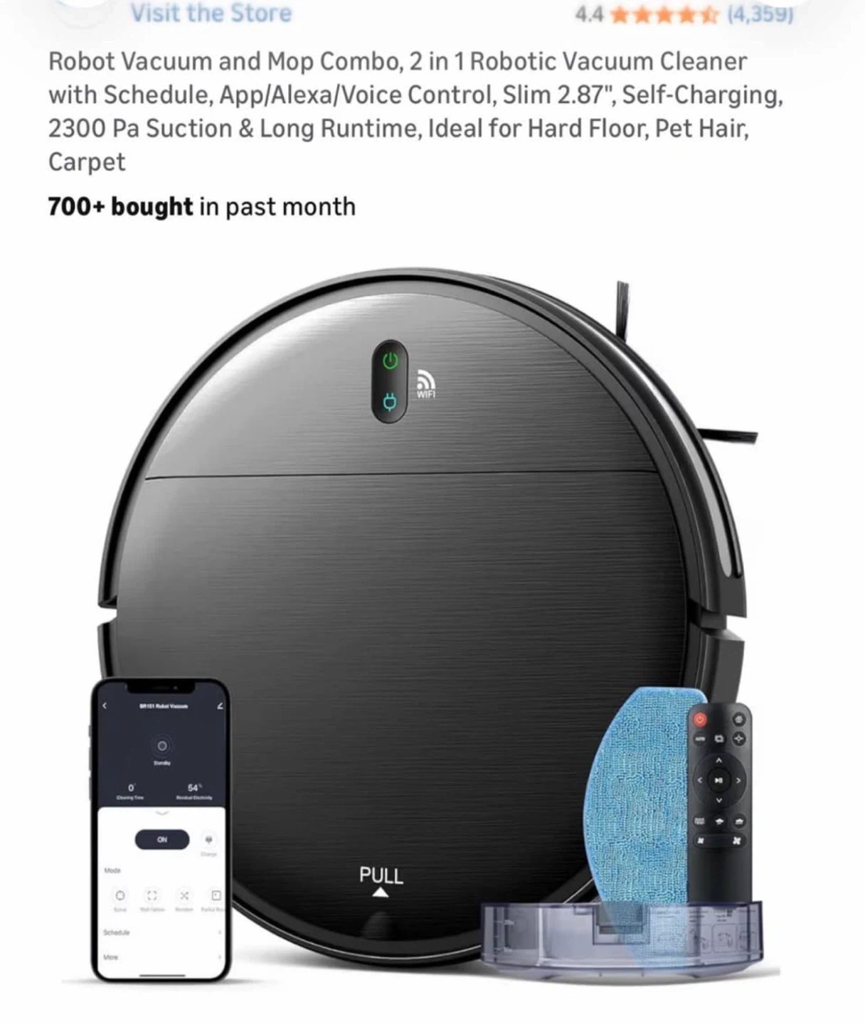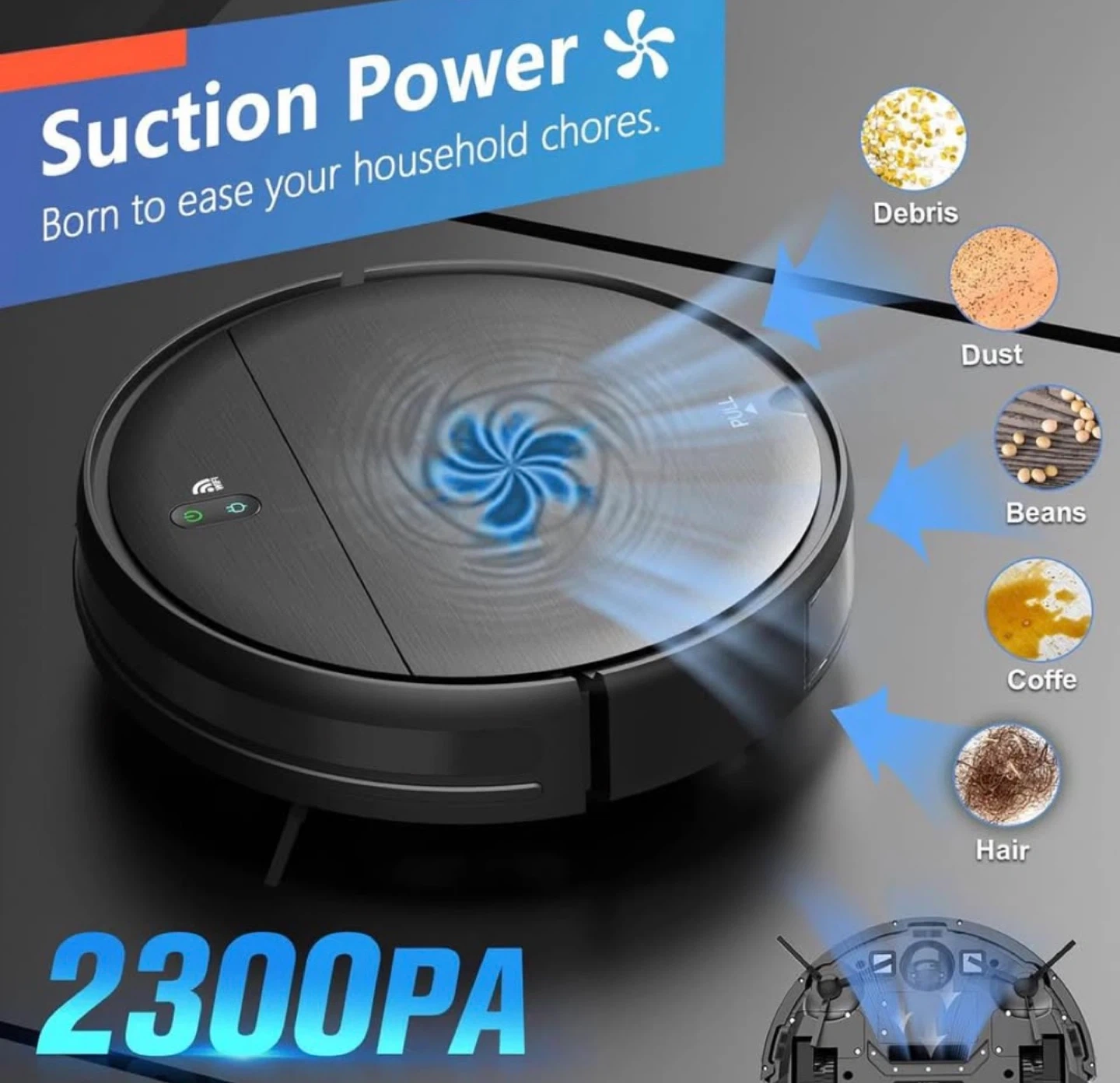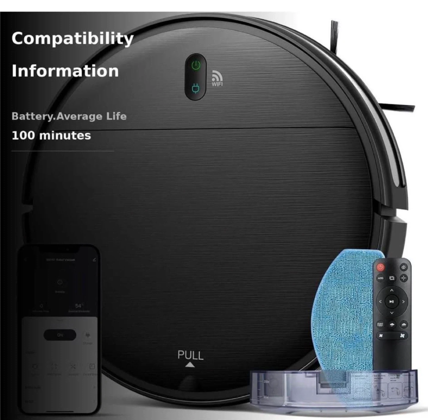 This robot vacuum is designed for automatic charging and covers up to 1290 sqft. It offers a runtime of 100 minutes and features 2300 Pa suction power. Includes remote control and charging dock.