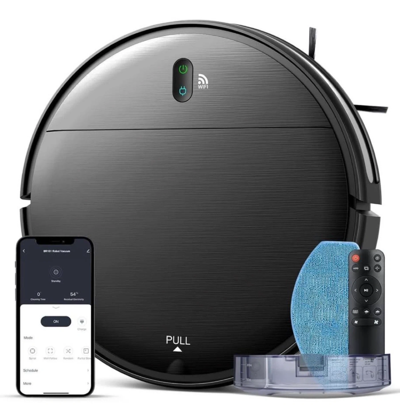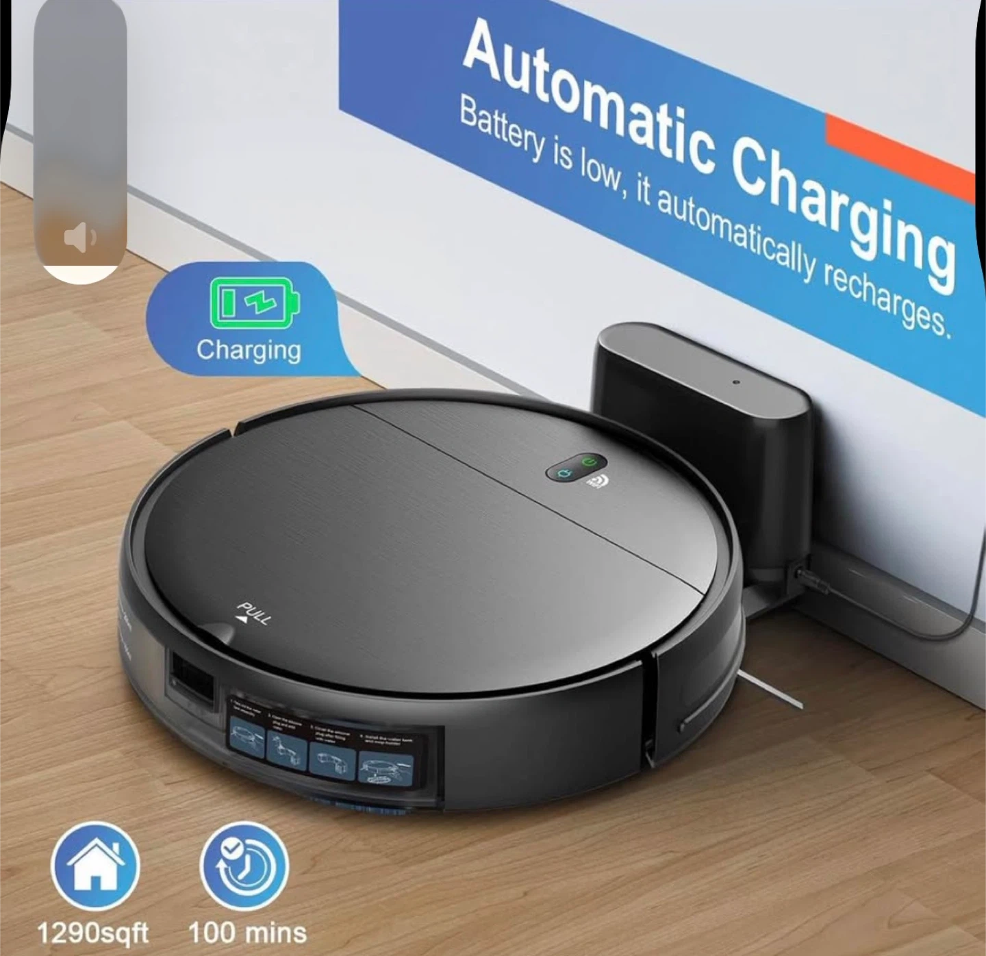 This robot vacuum is designed for automatic charging and covers up to 1290 sqft. It offers a runtime of 100 minutes and features 2300 Pa suction power. Includes remote control and charging dock.