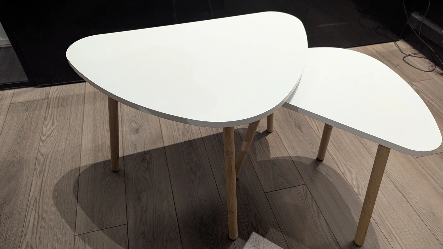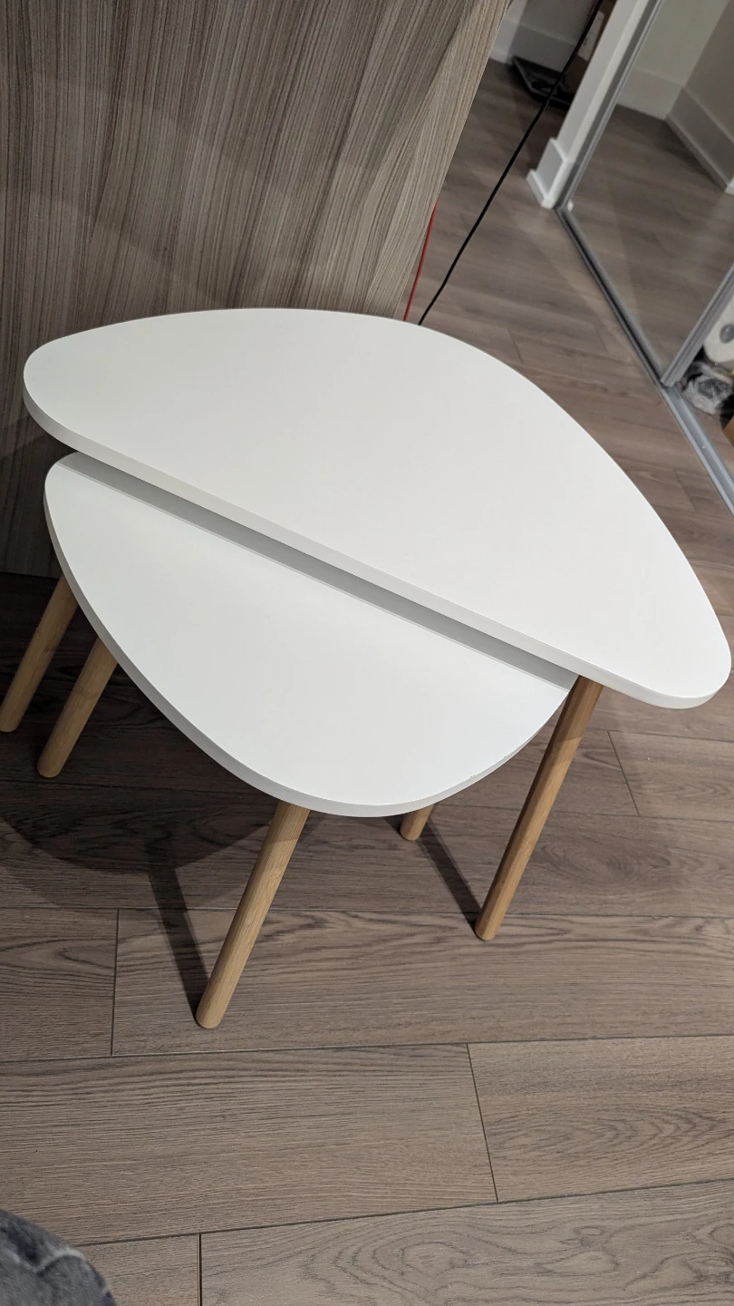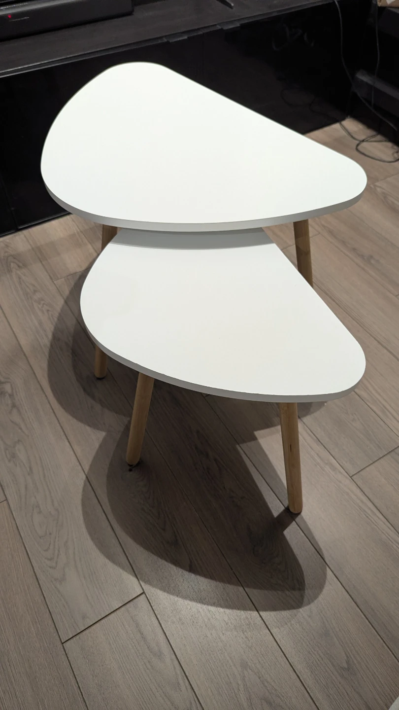 A set of two white nesting side tables with wooden legs. These tables are perfect for adding a bit of extra surface space in your living room or bedroom. The smaller table tucks neatly under the larger one when not in use.