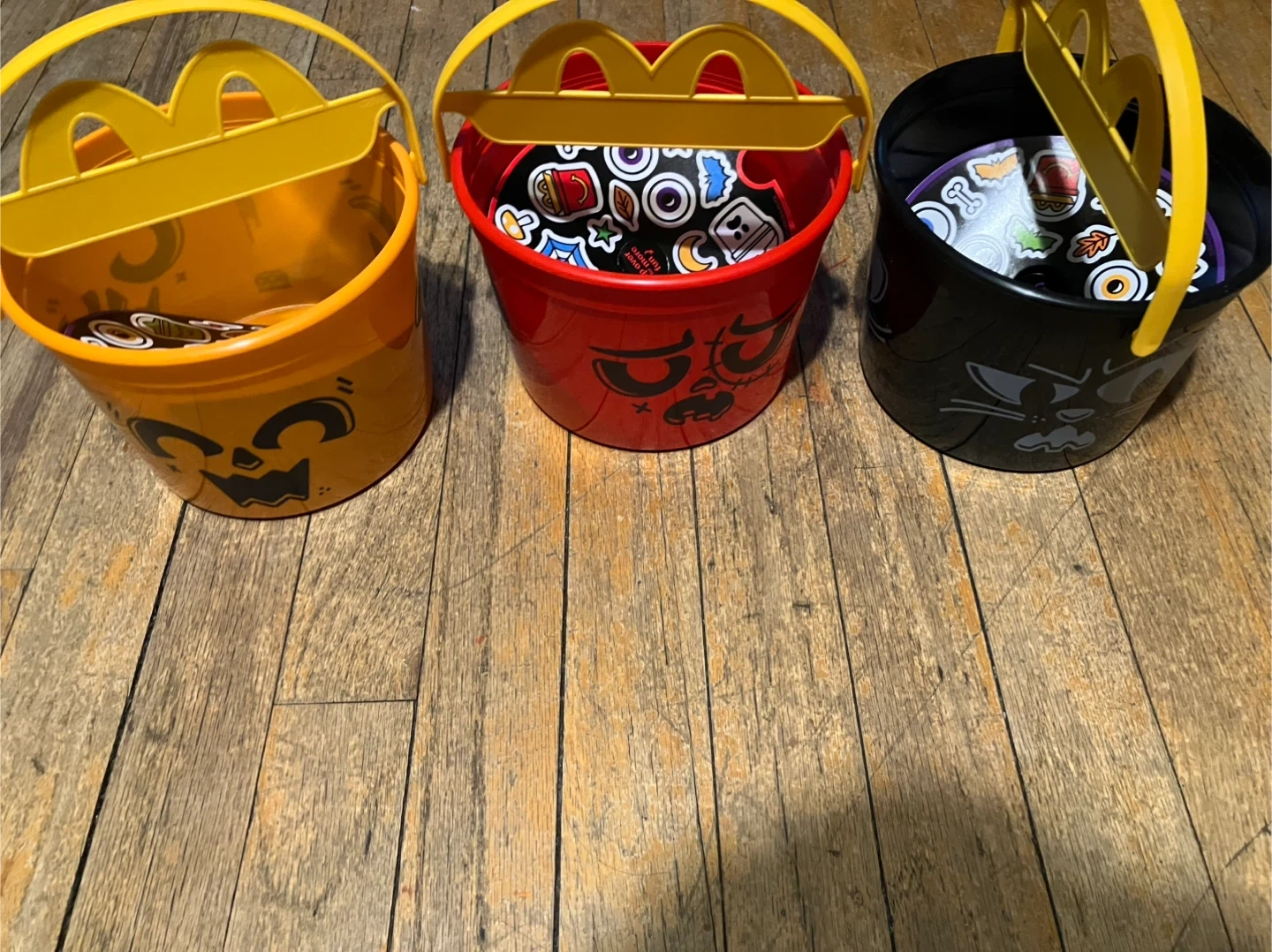 Selling a set of three McDonald's Halloween pails! These are the classic buckets with the iconic McDonald's handle. Great for collectors or for some Halloween fun. Each pail features a different spooky design in orange, red, and black.