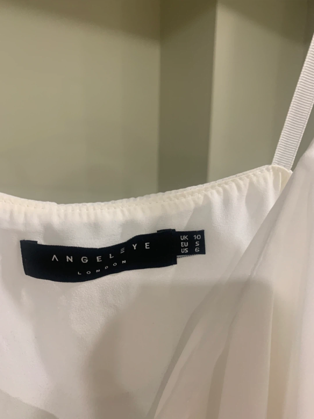 Here's a cute white top from Angeleye London! It's a size S and features a stylish lace-up design with delicate ruffles. Perfect for adding a touch of elegance to any outfit