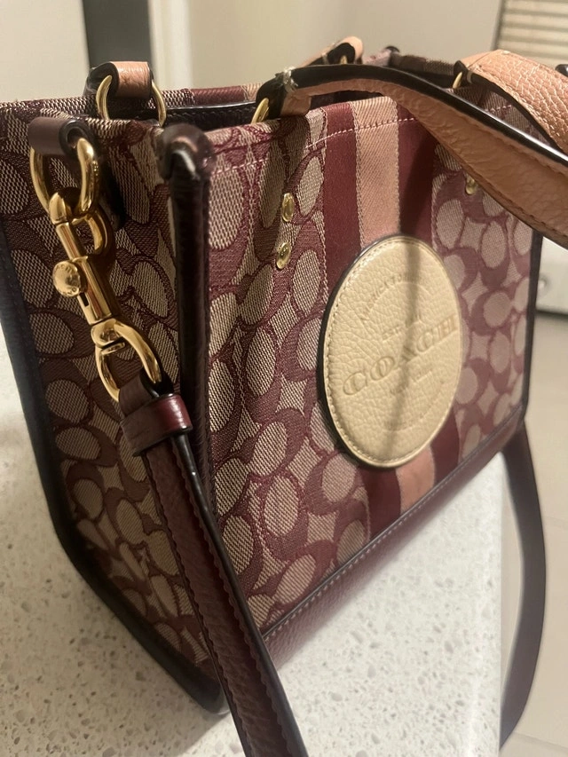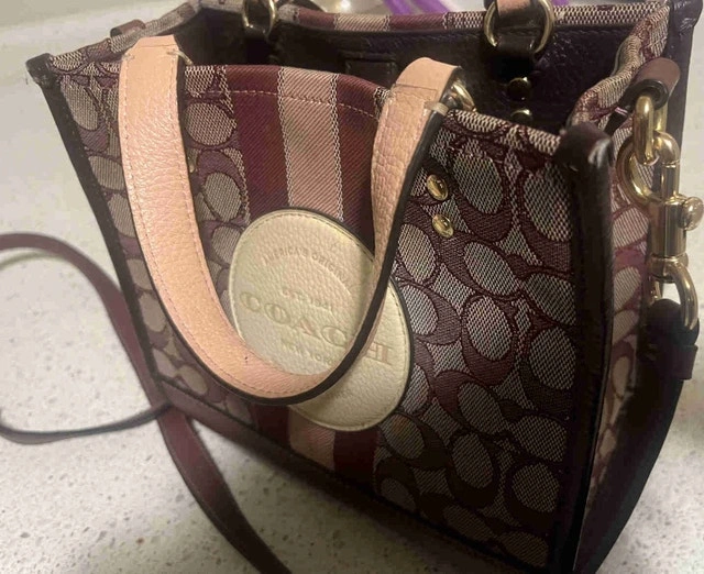 Check out this cute, pre-loved Coach tote! It's perfect for adding a touch of charm to your outfit. It's in good condition and ready for a new home. * Signature coated canvas * Striped details * Leather trim * Adjustable shoulder strap