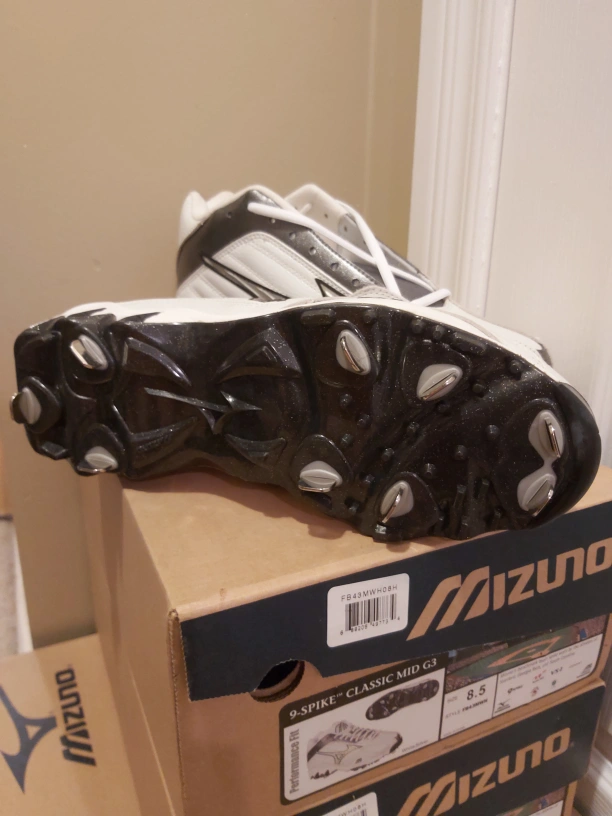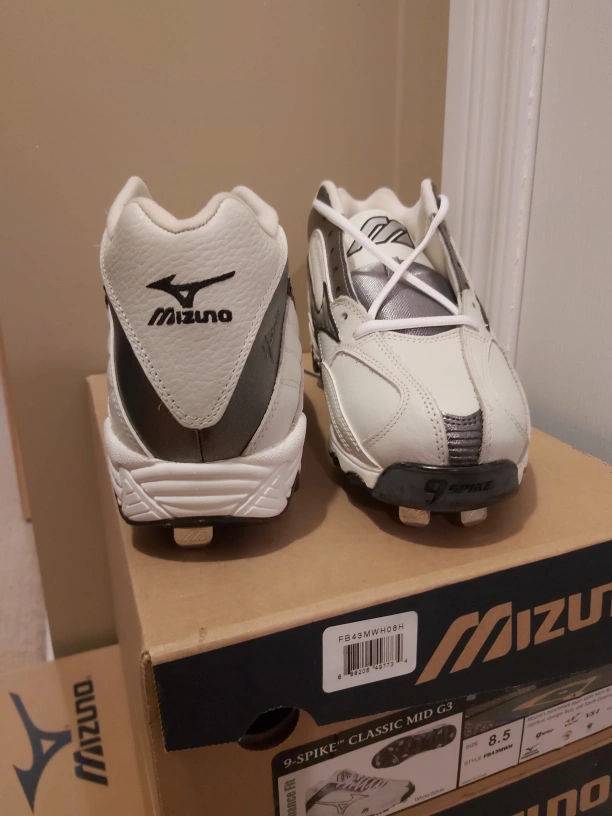 NEW White and grey Mizuno 9-Spike Classic Mid G3 baseball cleats. Size is 8.5. These cleats feature a 9-spike configuration for traction on the field.