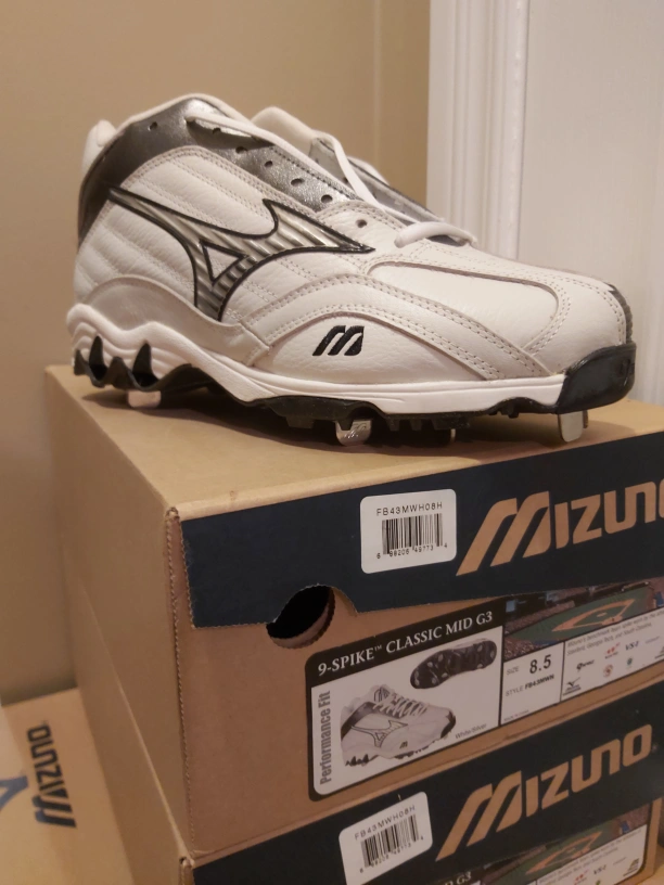 NEW White and grey Mizuno 9-Spike Classic Mid G3 baseball cleats. Size is 8.5. These cleats feature a 9-spike configuration for traction on the field.