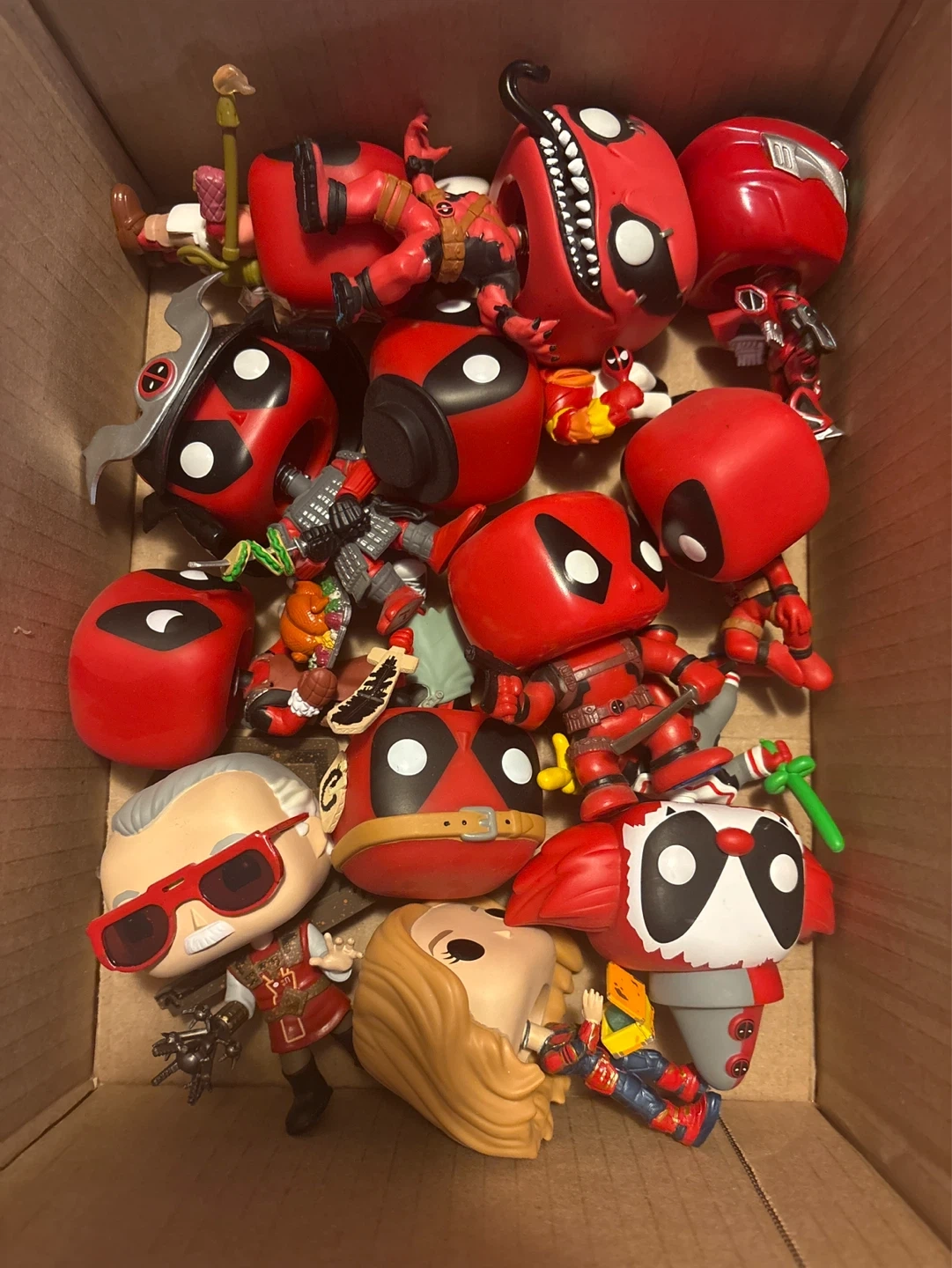Includes a variety of Funko Pop! vinyl figures featuring Deadpool and other characters. Figures are in good condition.