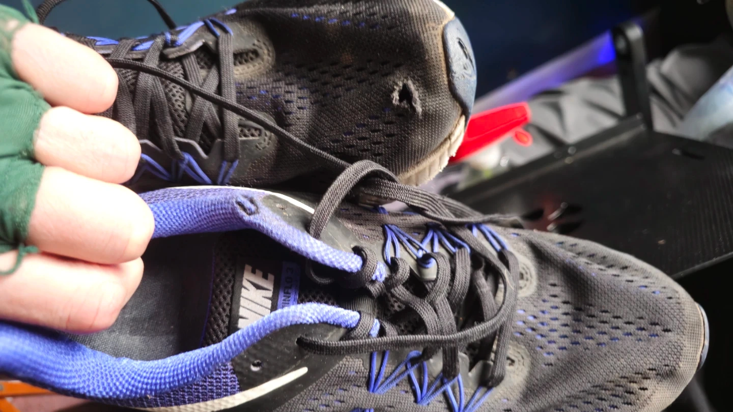 These Nike running shoes are black with blue accents. They're well-worn but still functional. Mesh upper for breathability. Giving as received them. Few spots but still reliable.