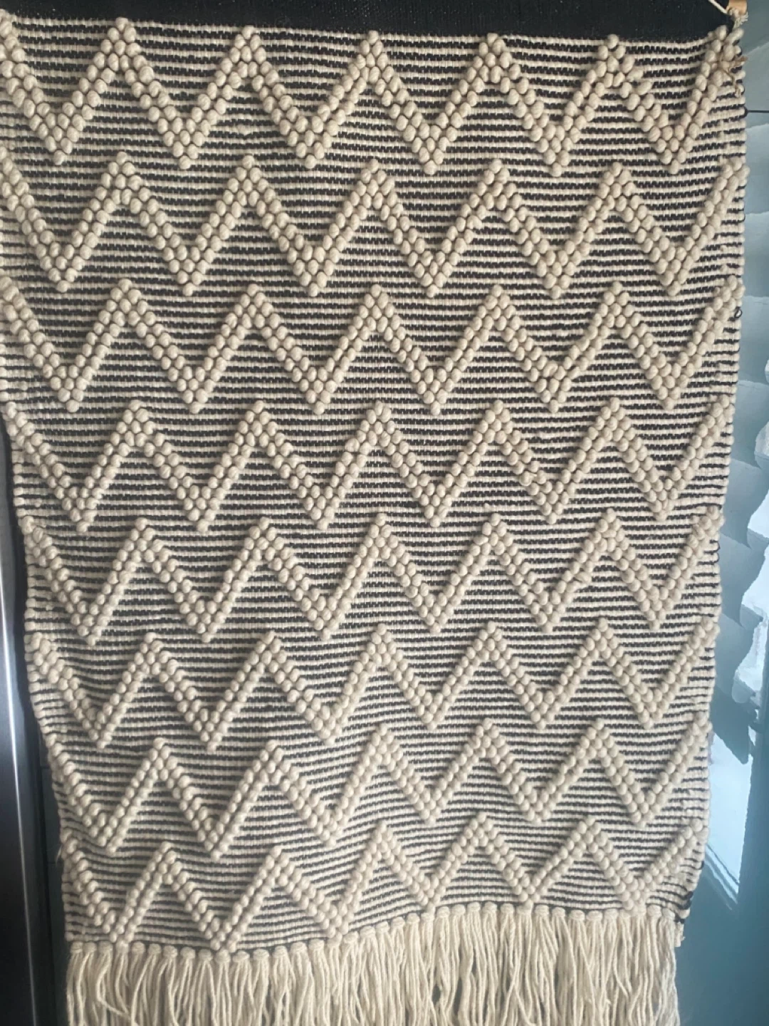 A Beautiful navy and white macramé wall hanging that adds texture and warmth to any space. Perfect for bohemian, coastal, or modern décor. In perfect condition. Great knot details.