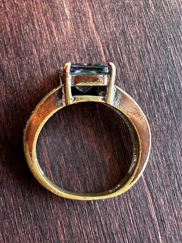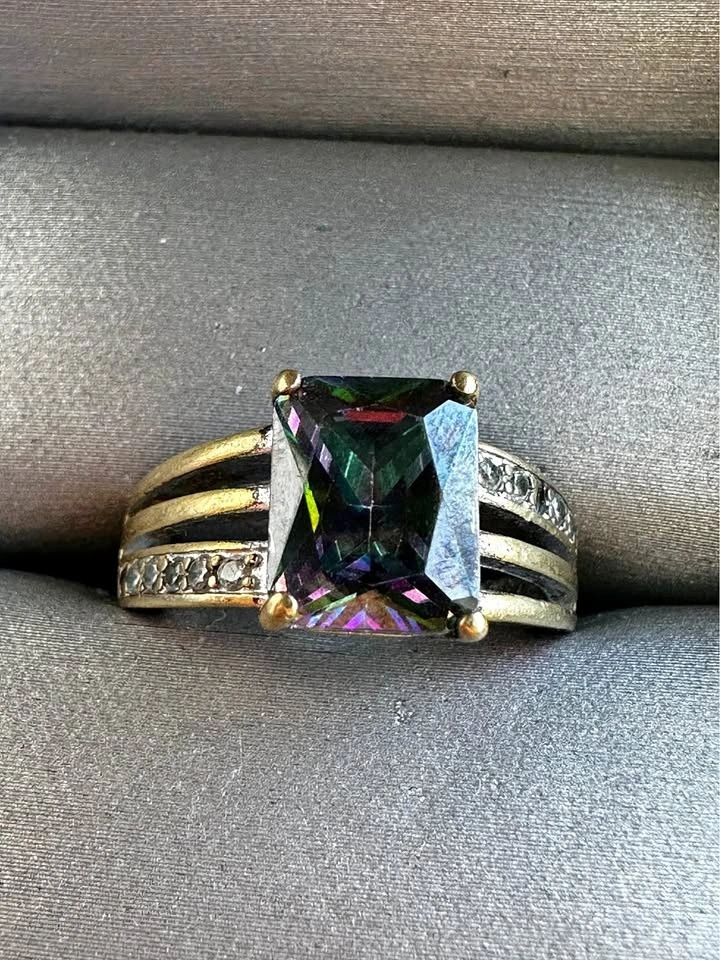 Sparkly ring with a large rectangular iridescent stone, similar to mystic topaz. The band features smaller clear stones on the sides. Size 6. Note: One small side stone is missing.