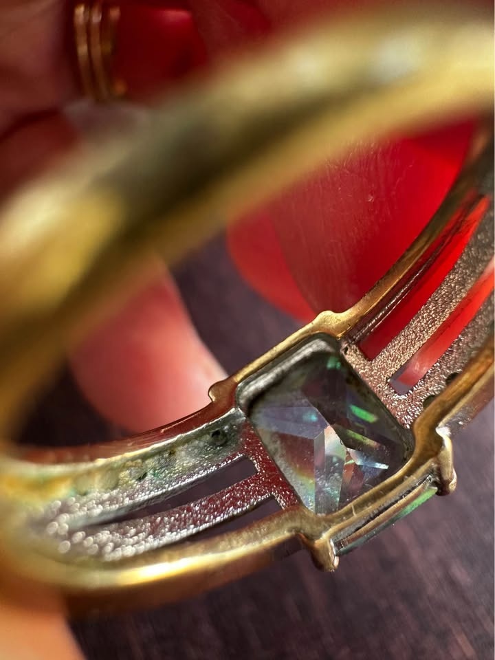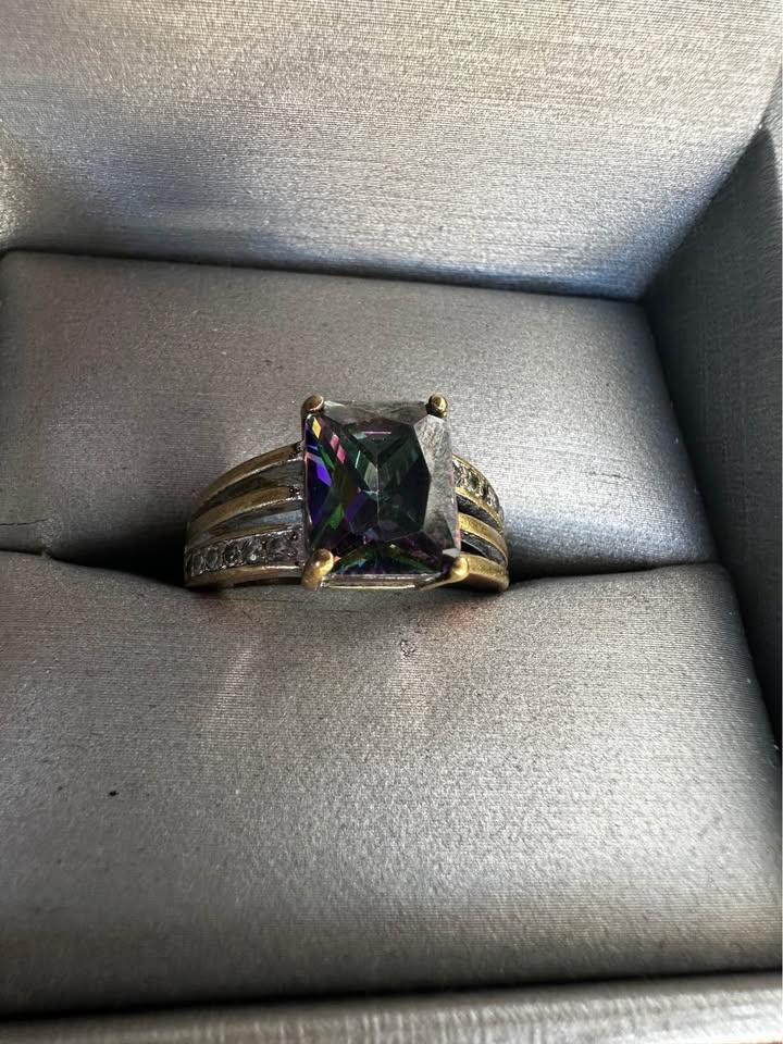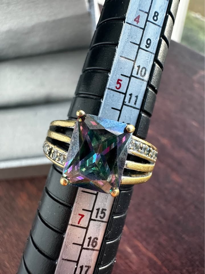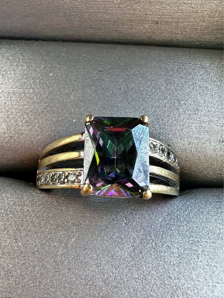 Sparkly ring with a large rectangular iridescent stone, similar to mystic topaz. The band features smaller clear stones on the sides. Size 6. Note: One small side stone is missing.