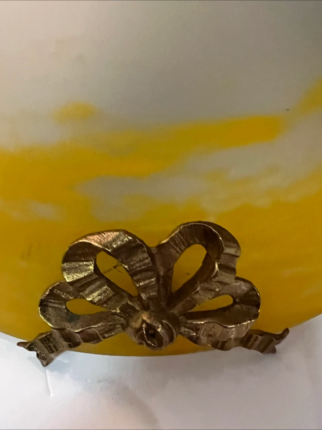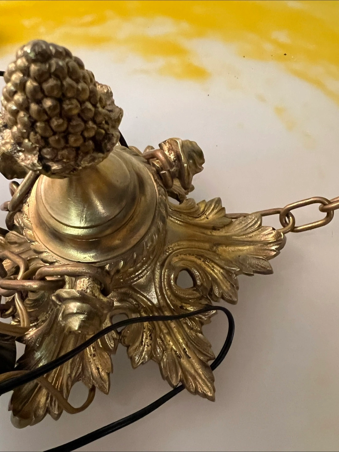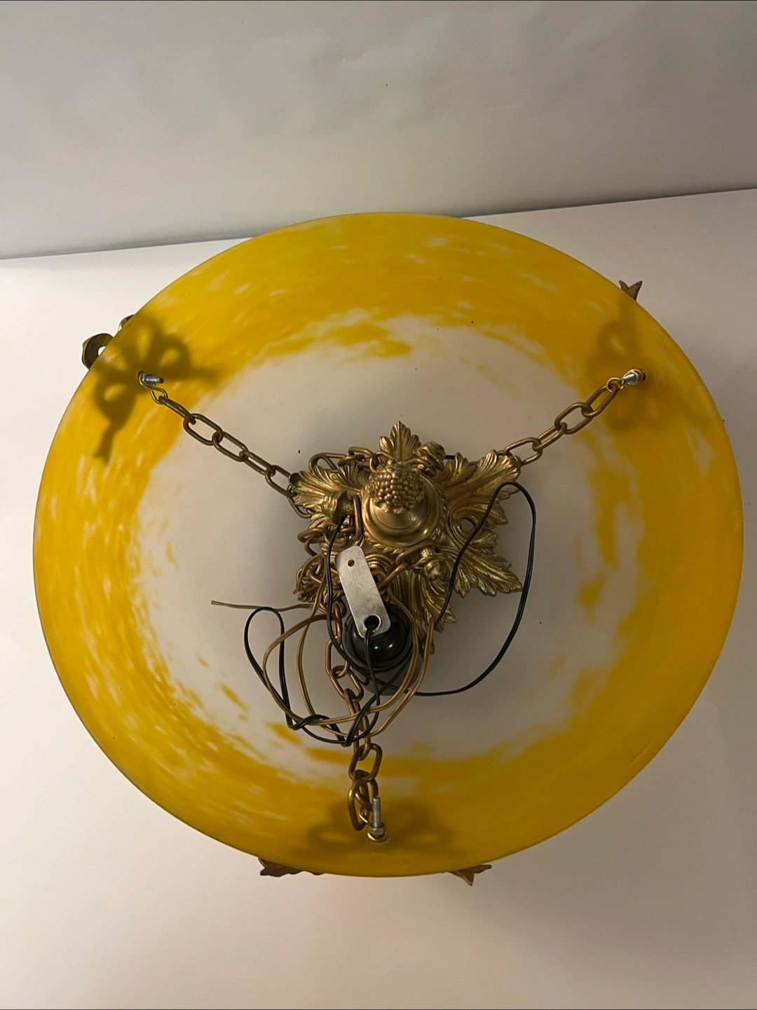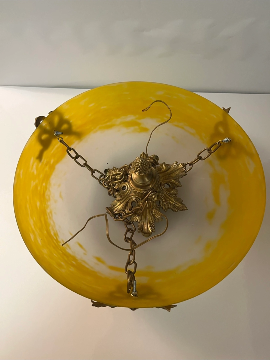 Beautiful French vintage ceiling light fixture. Features a brass frame with ornate detailing and a lovely yellow and white glass shade. Three chains for hanging. Pre-owned, shows some signs of age and use.