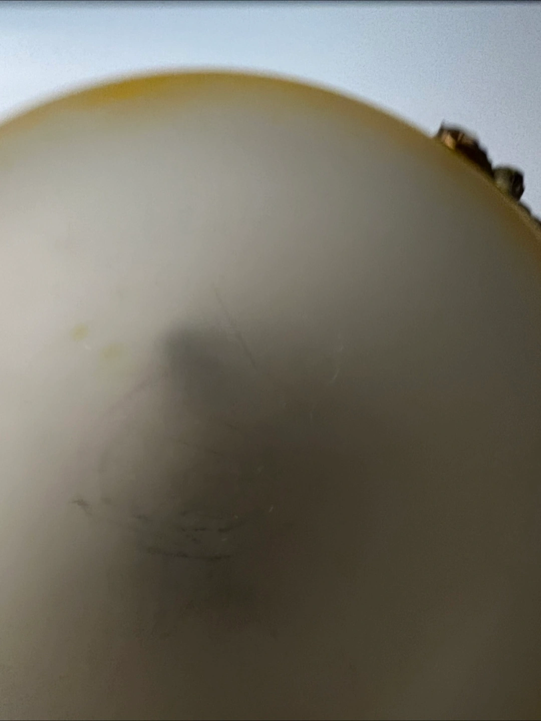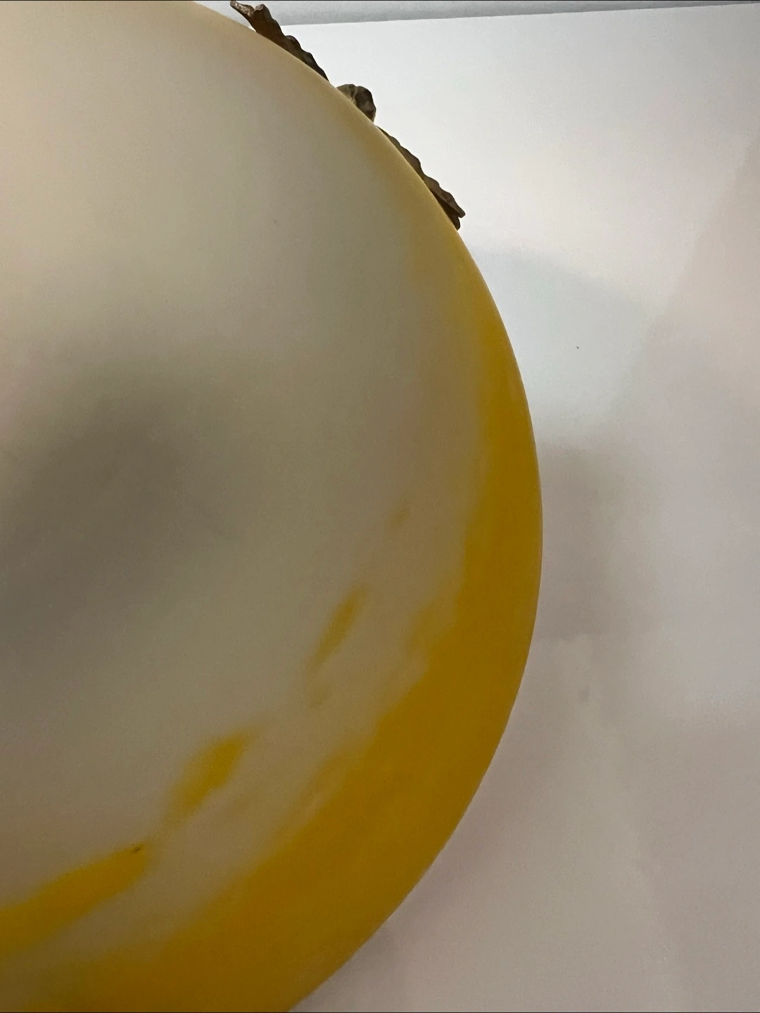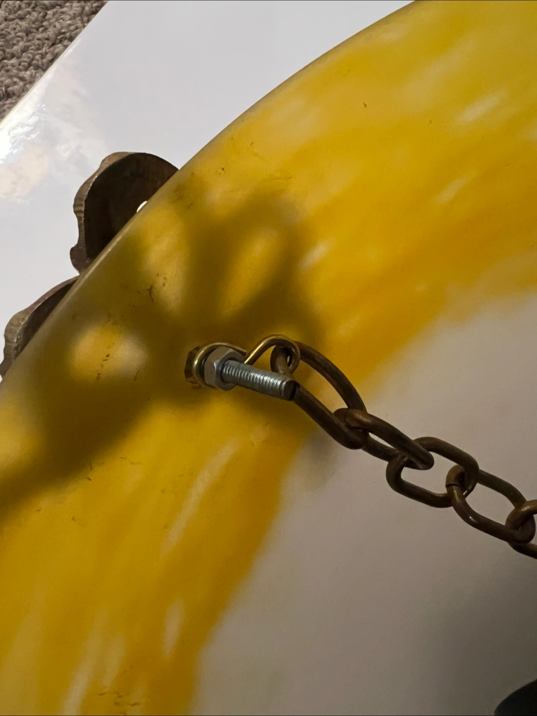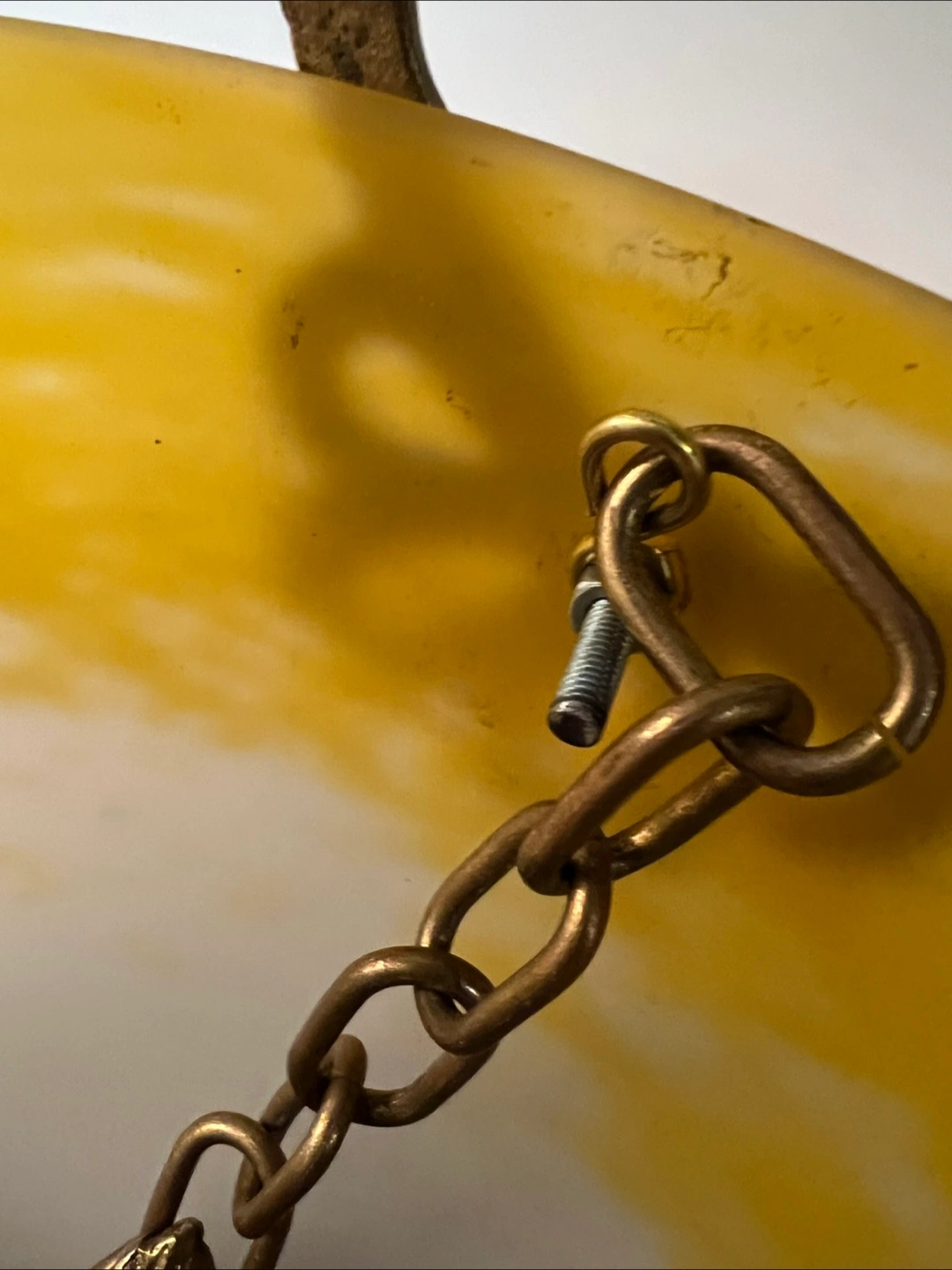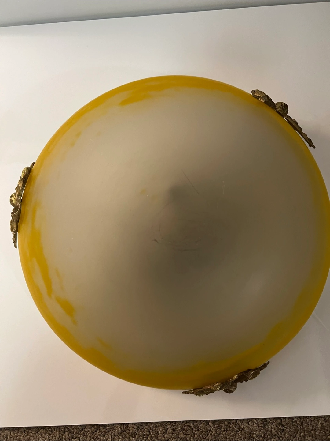 Beautiful French vintage ceiling light fixture. Features a brass frame with ornate detailing and a lovely yellow and white glass shade. Three chains for hanging. Pre-owned, shows some signs of age and use.