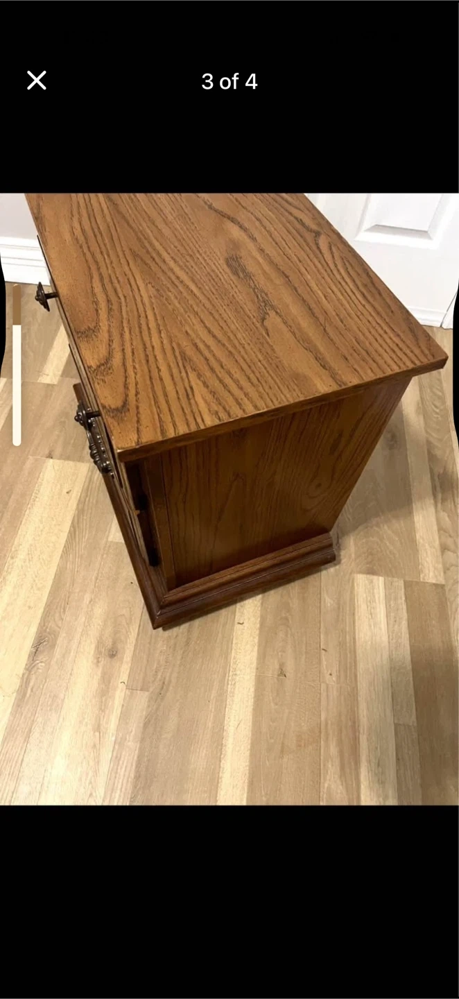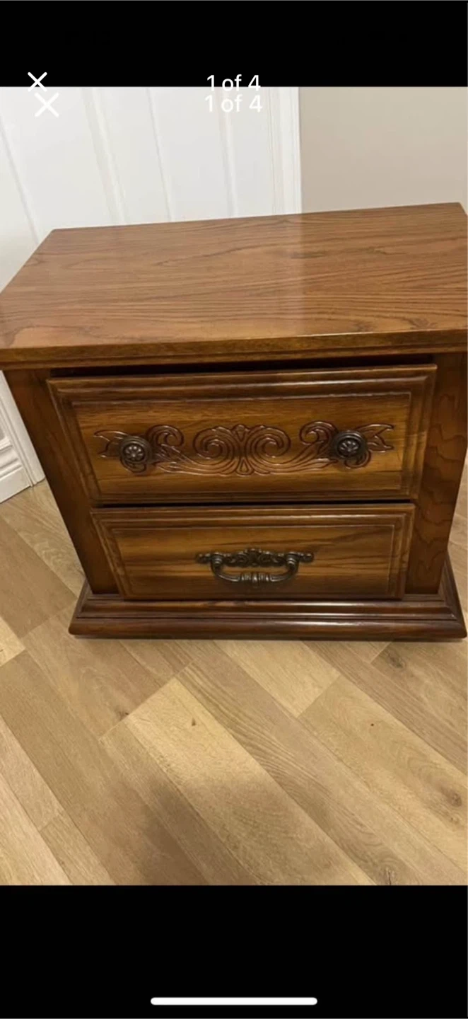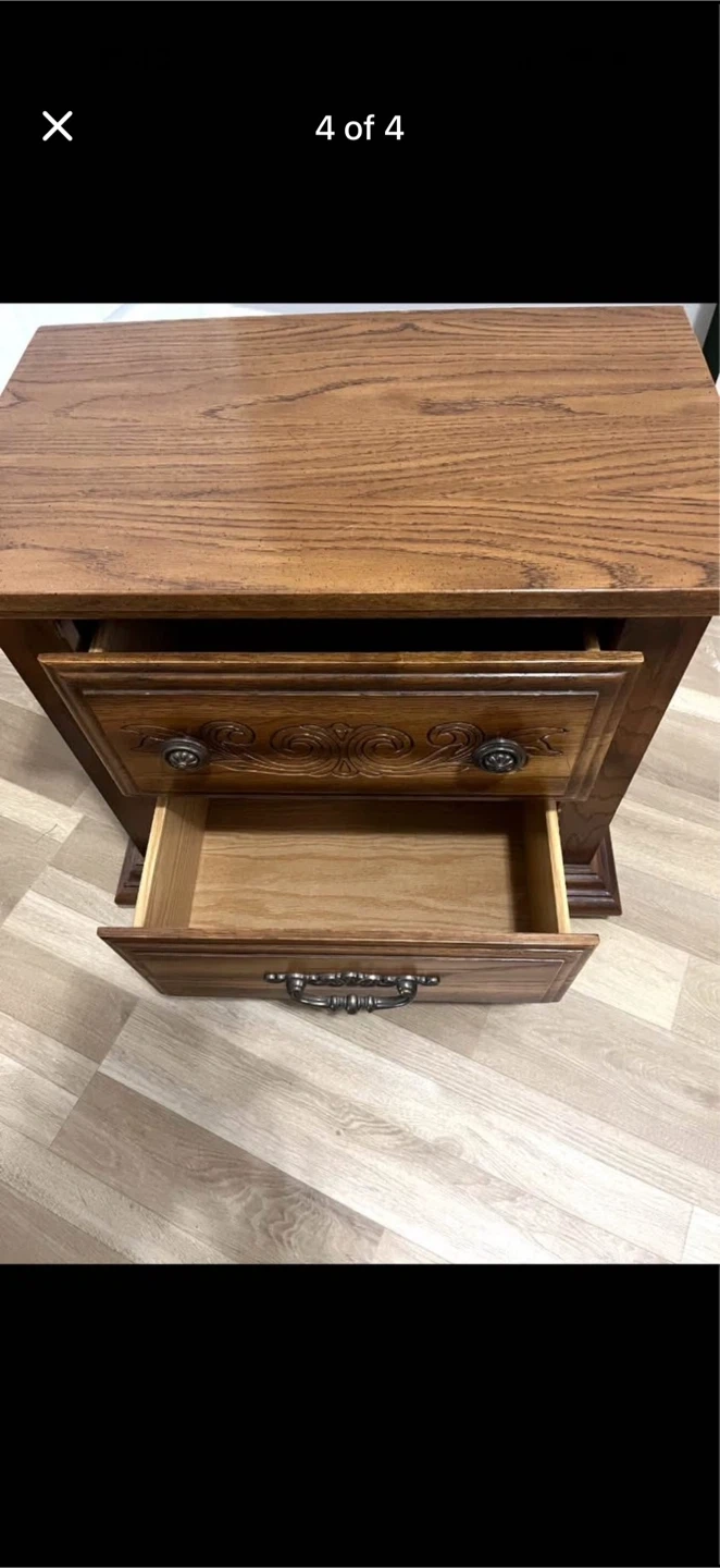 Solid Oak nightstand with two drawers. It features ornate detailing on the top drawer and dark metal hardware.