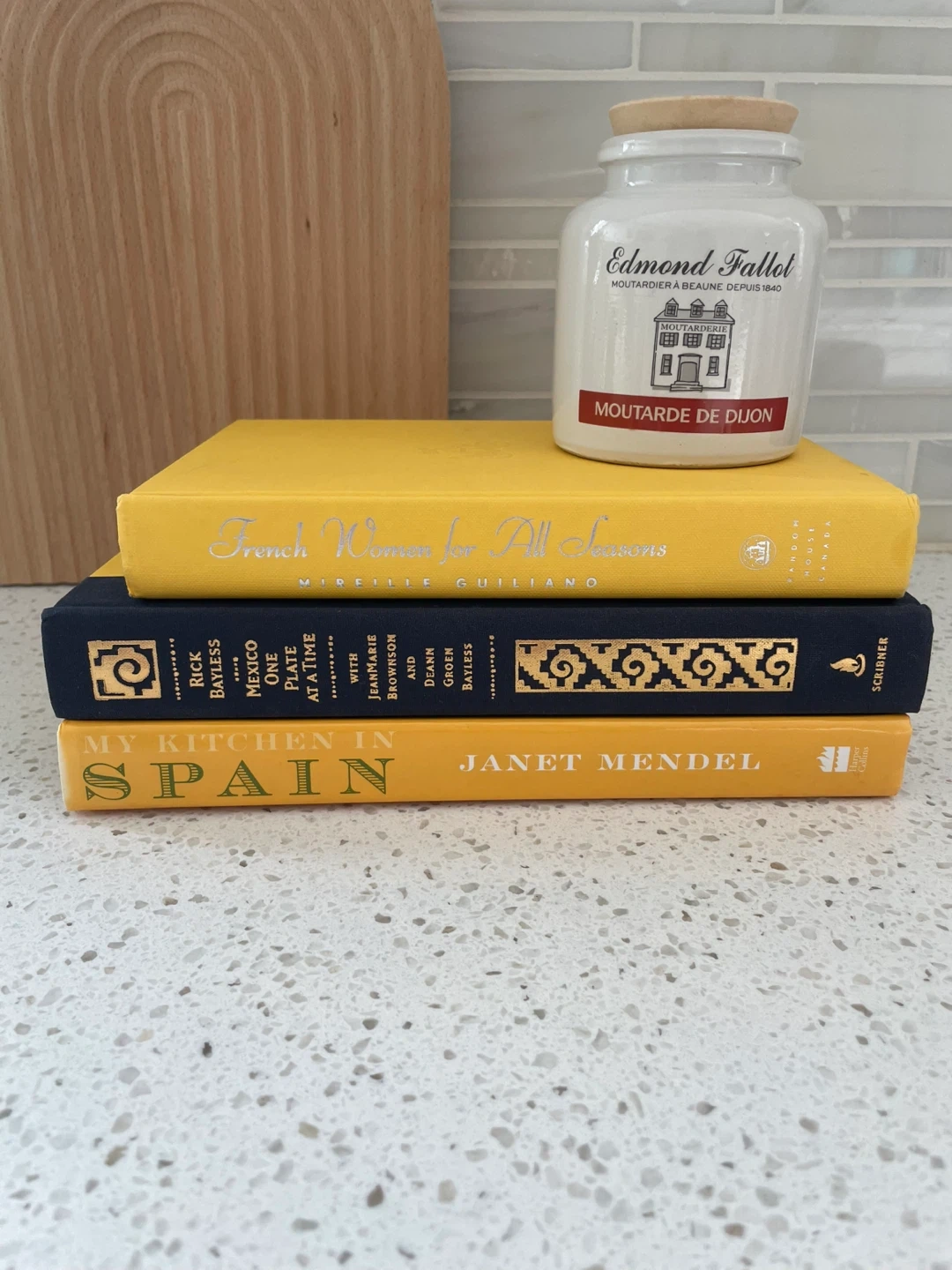 Three hardcover cookbooks included: 'My Kitchen in Spain' by Janet Mendel, 'Mexico One Plate at a Time' by Rick Bayless, and 'French Women for All Seasons' by Mireille Guiliano. These culinary guides cover diverse cuisines and cooking techniques.