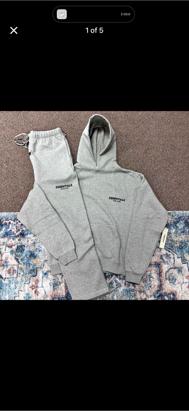 This is a grey hoodie and sweatpants set from Essentials Fear of God. It's made of a soft cotton blend material. The set is great for casual wear.