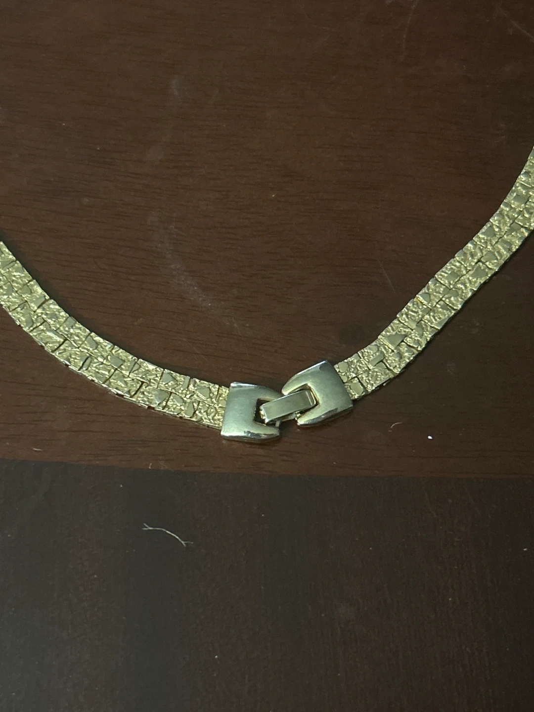 This is a gold tone chain necklace. It has a textured surface and a fold-over clasp. The chain is about 18 inches long.