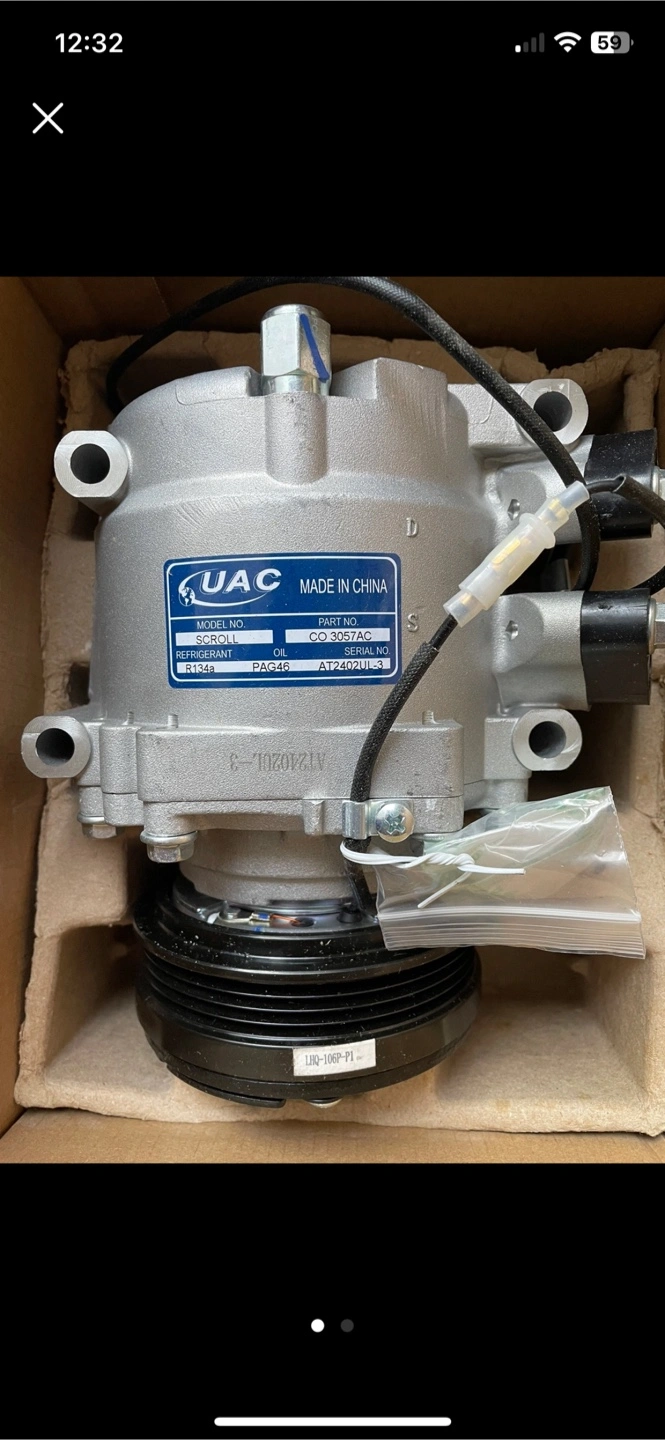 Brand new AC compressor for a vehicle, still in the original packaging. The model number is CO 3057AC. Part number is AT 2407UL-3. The refrigerant is R134a and the oil is PAG46. The compressor is made in China. The box is labelled with a date of 05/16/2024.