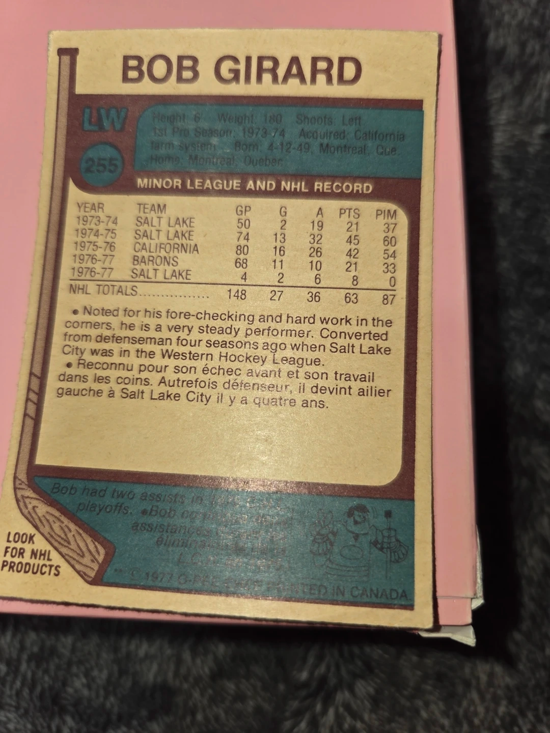 This is a 1977-78 O-Pee-Chee hockey card for Bob Girard. It features his NHL and minor league stats from various seasons. The card also includes notes on his playing style and career highlights.