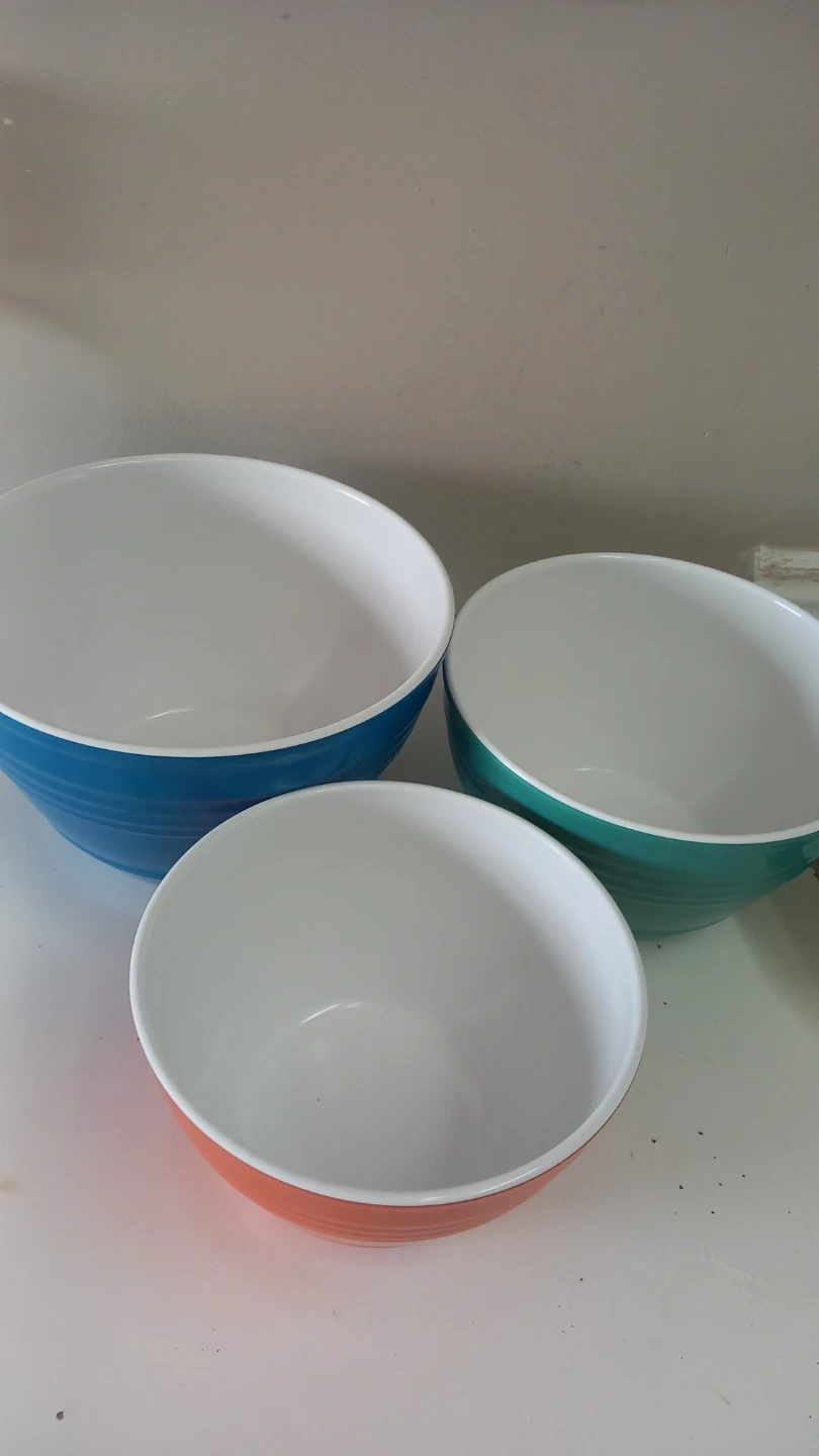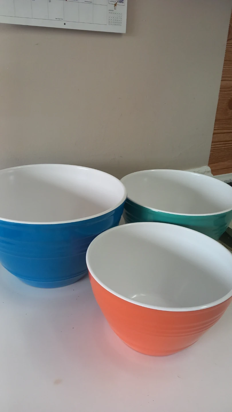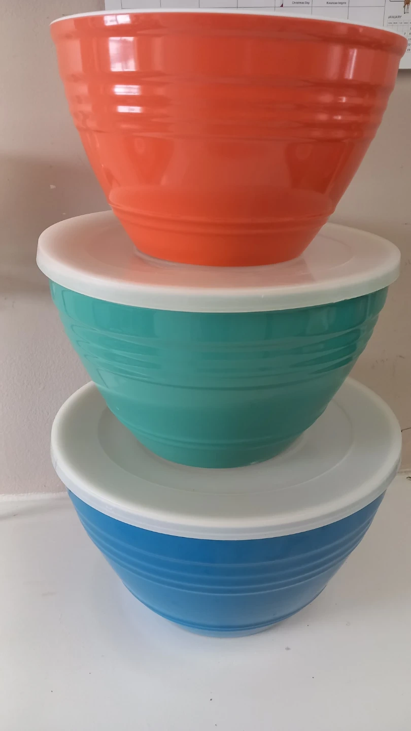 This set includes three mixing bowls in vibrant blue, teal, and orange. They're made of durable material and come with white lids for convenient storage. Great for prep work or storing leftovers!