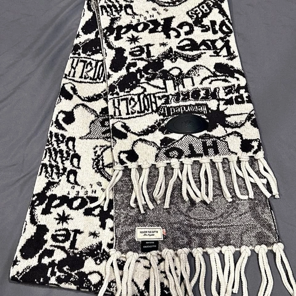 Honor The Gift Disco Rodeo Knit Scarf in Oatmeal. This premium knit scarf features a bold, all-over 'Disco Rodeo' graphic print with integrated branding and star motifs. Designed with a substantial weight for warmth and finished with classic fringed edges.