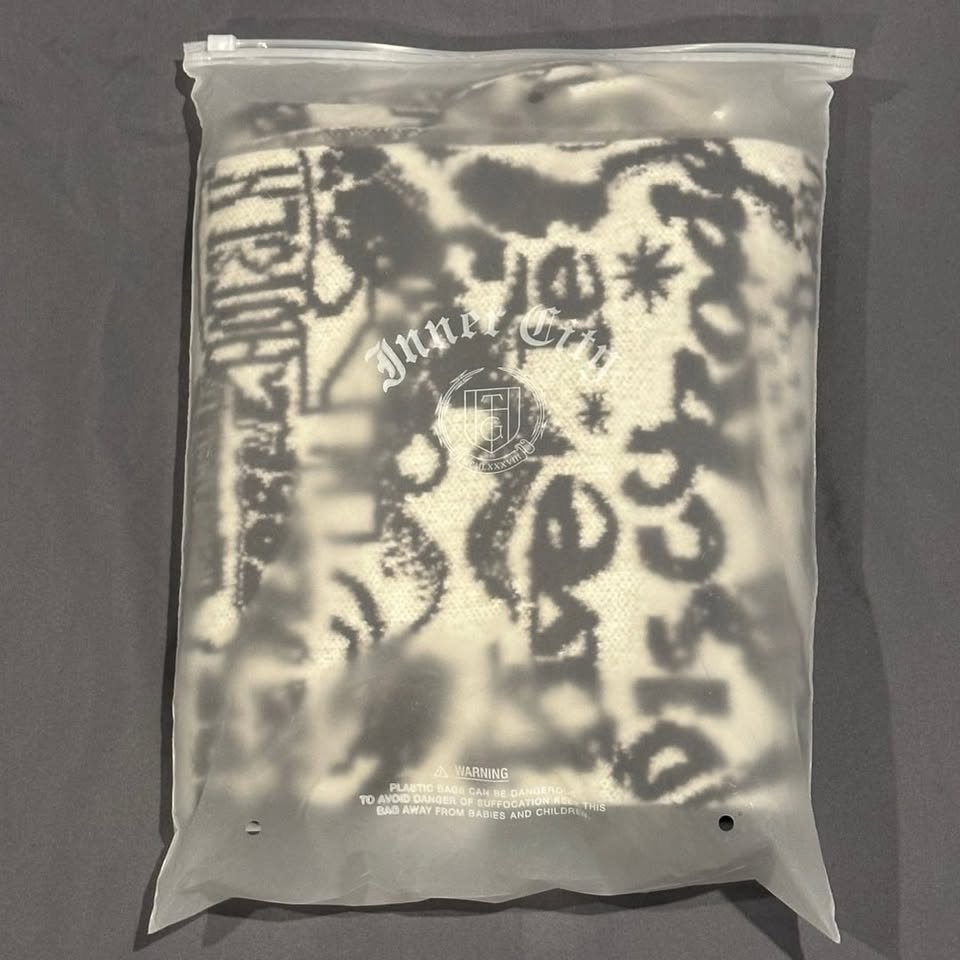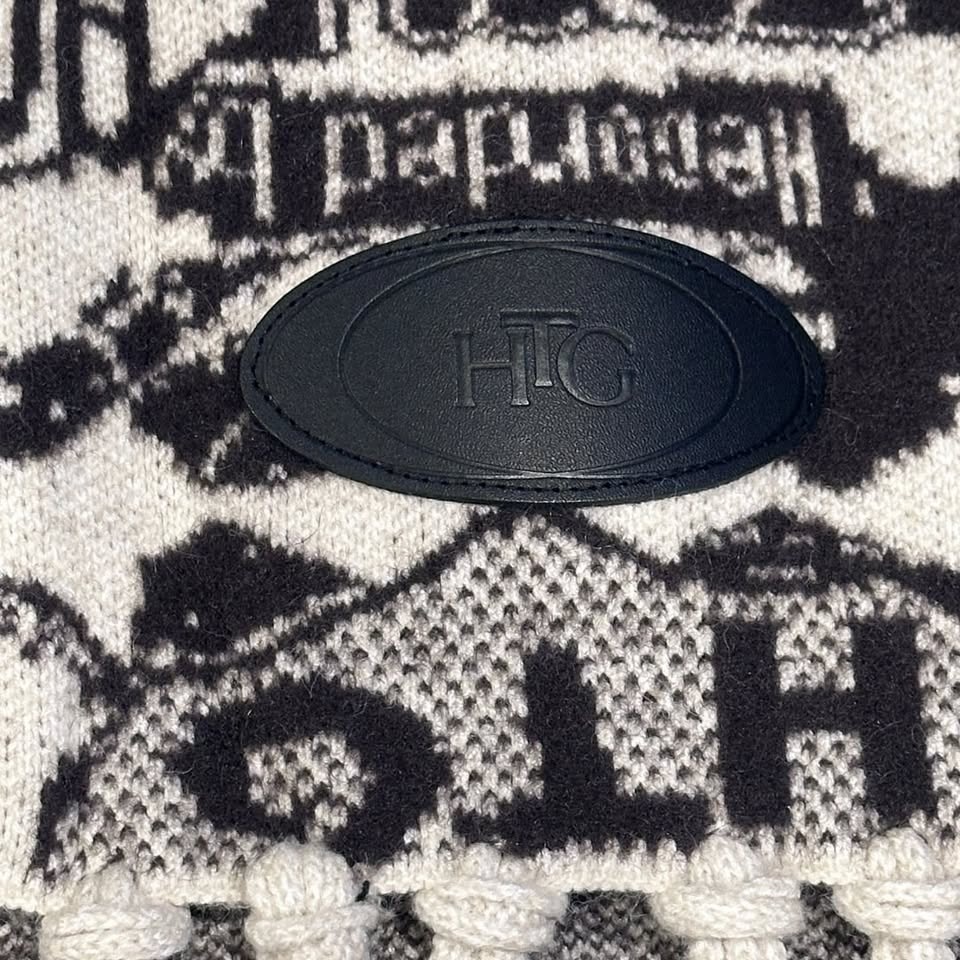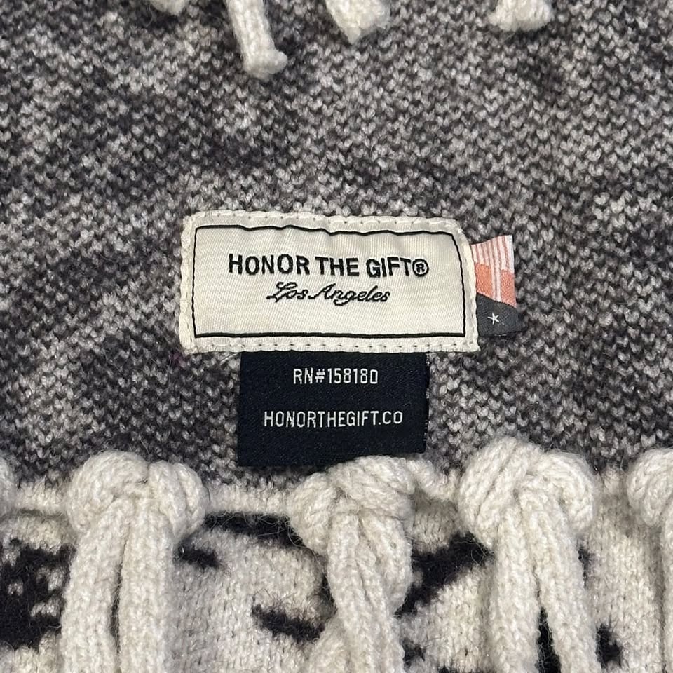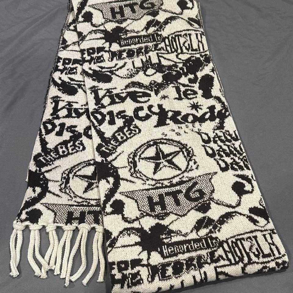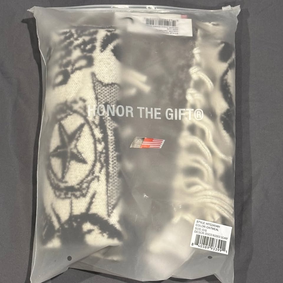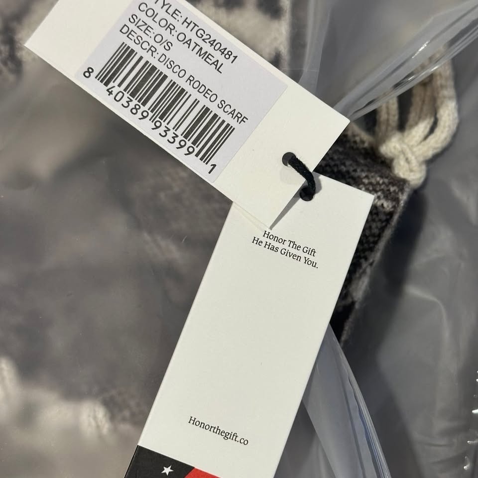 Honor The Gift Disco Rodeo Knit Scarf in Oatmeal. This premium knit scarf features a bold, all-over 'Disco Rodeo' graphic print with integrated branding and star motifs. Designed with a substantial weight for warmth and finished with classic fringed edges.