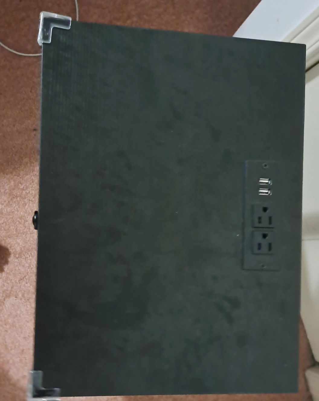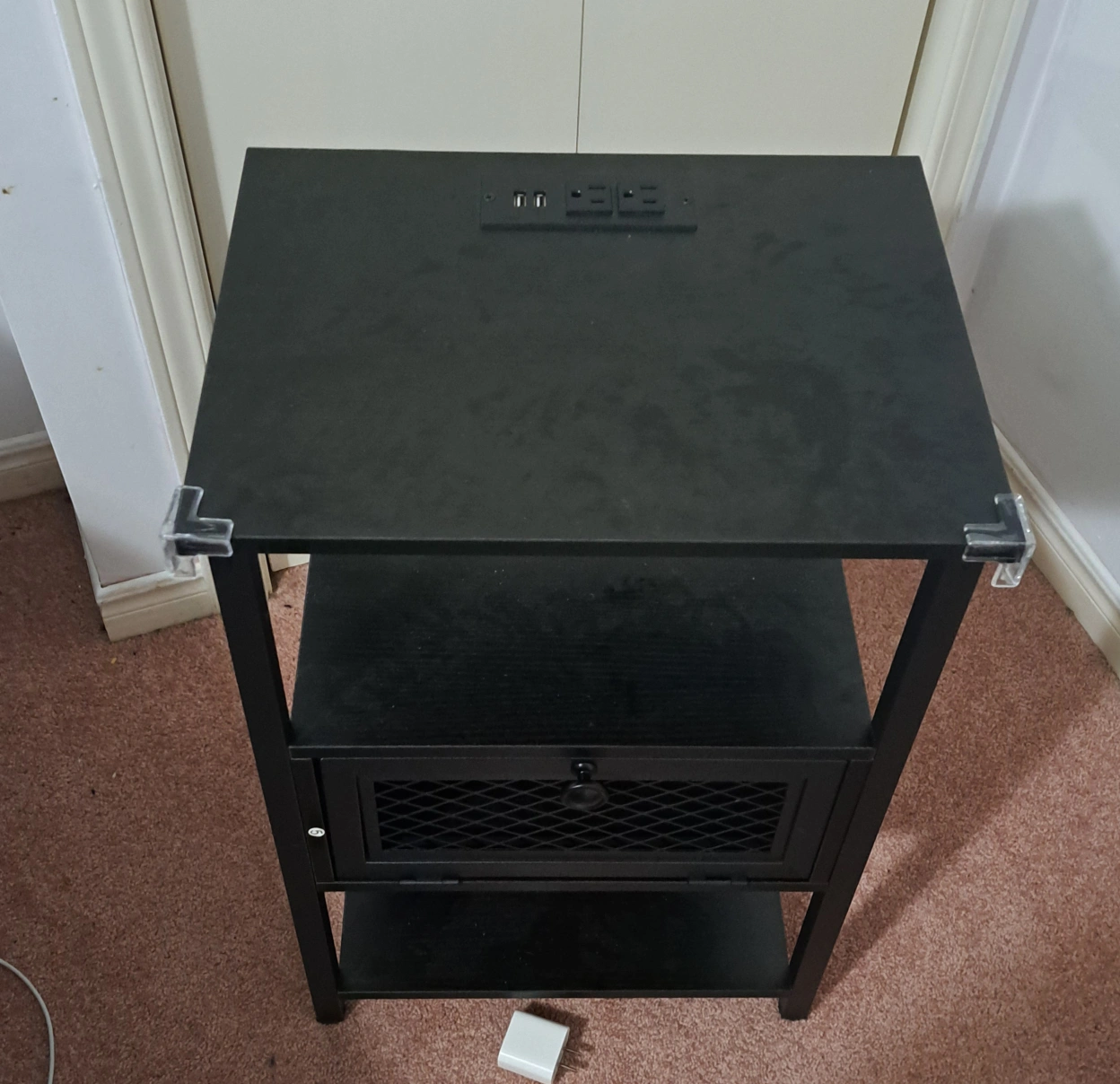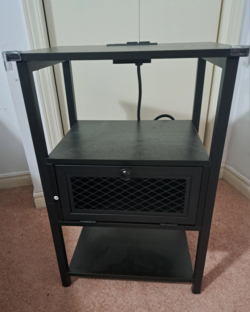 Small black nightstand. Two shelves, one drawer. Built-in power outlets and USB ports. Minor wear.