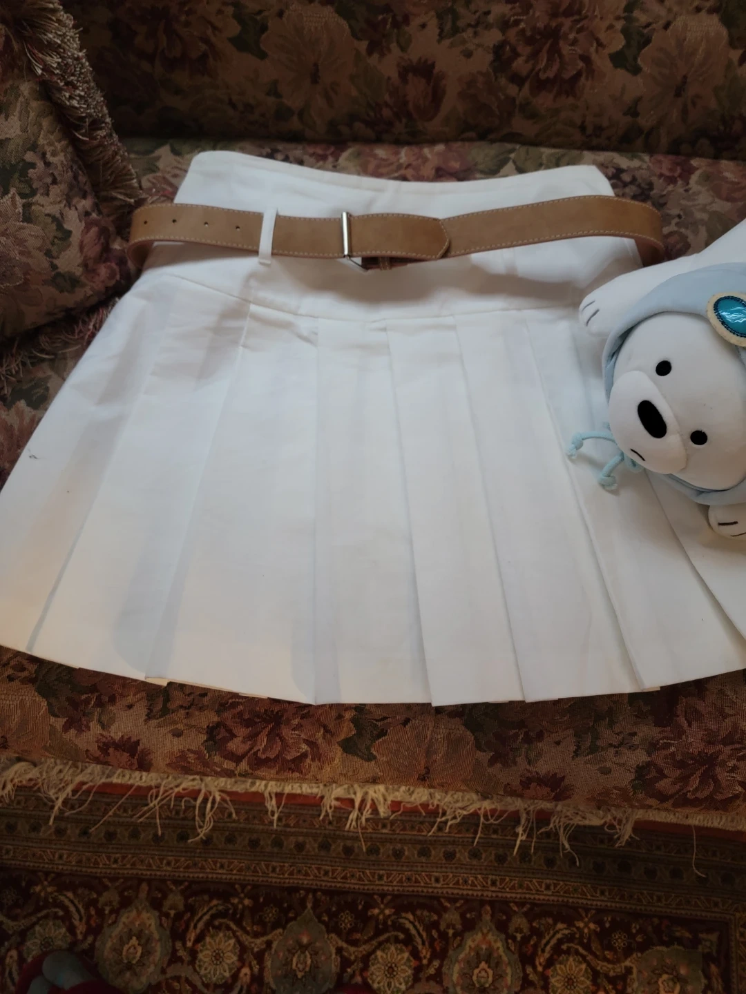 This is a ZARA white pleated mini skirt. It features a brown faux leather belt with a buckle closure. The skirt is made in Turkey. It's a size S, with EUR S, USA S, and MEX 26 sizing indicated. This skirt is perfect for casual wear or can be dressed up for a more polished look!