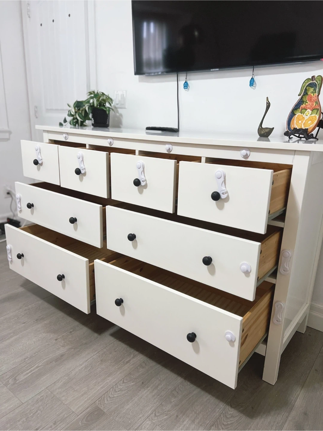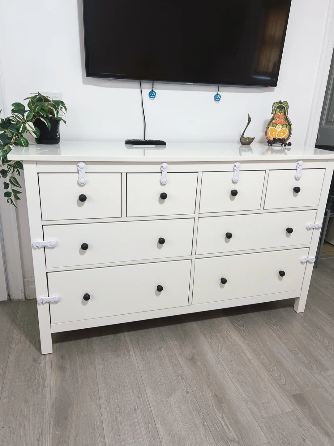 This IKEA HEMNES 8-drawer dresser is good condition . New high quality black knobs. Great for organizing your bedroom!