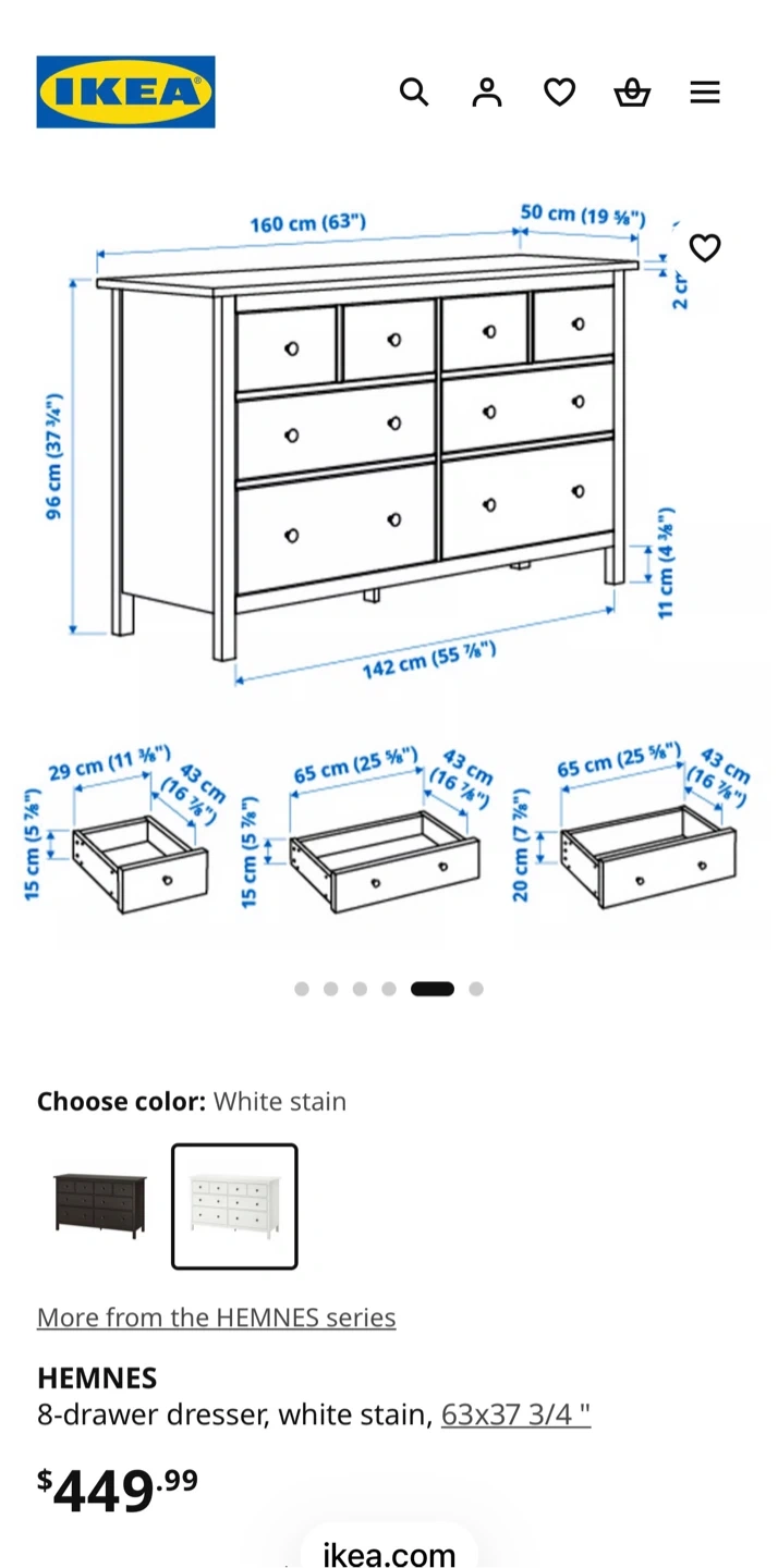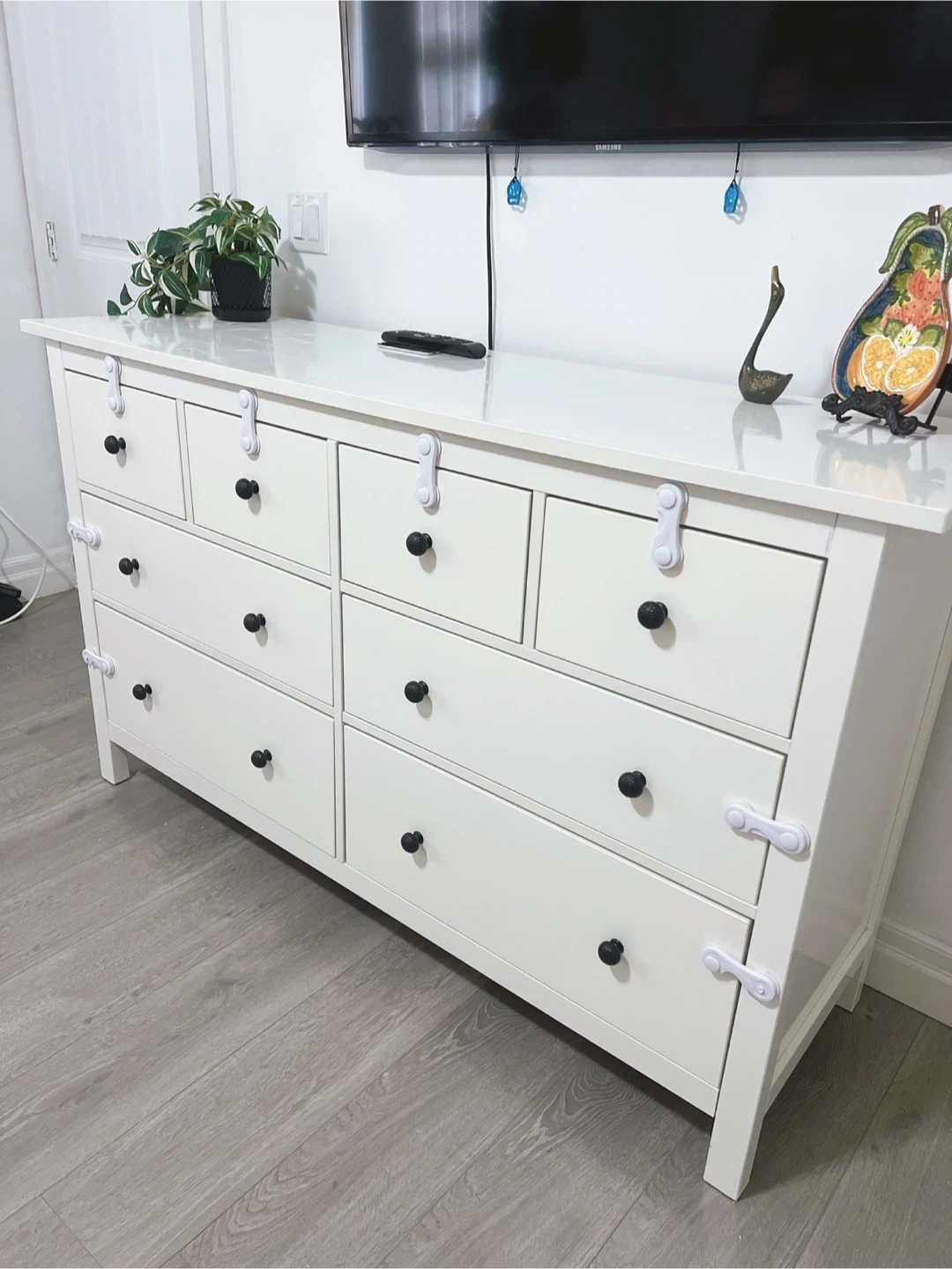 This IKEA HEMNES 8-drawer dresser is good condition . New high quality black knobs. Great for organizing your bedroom!