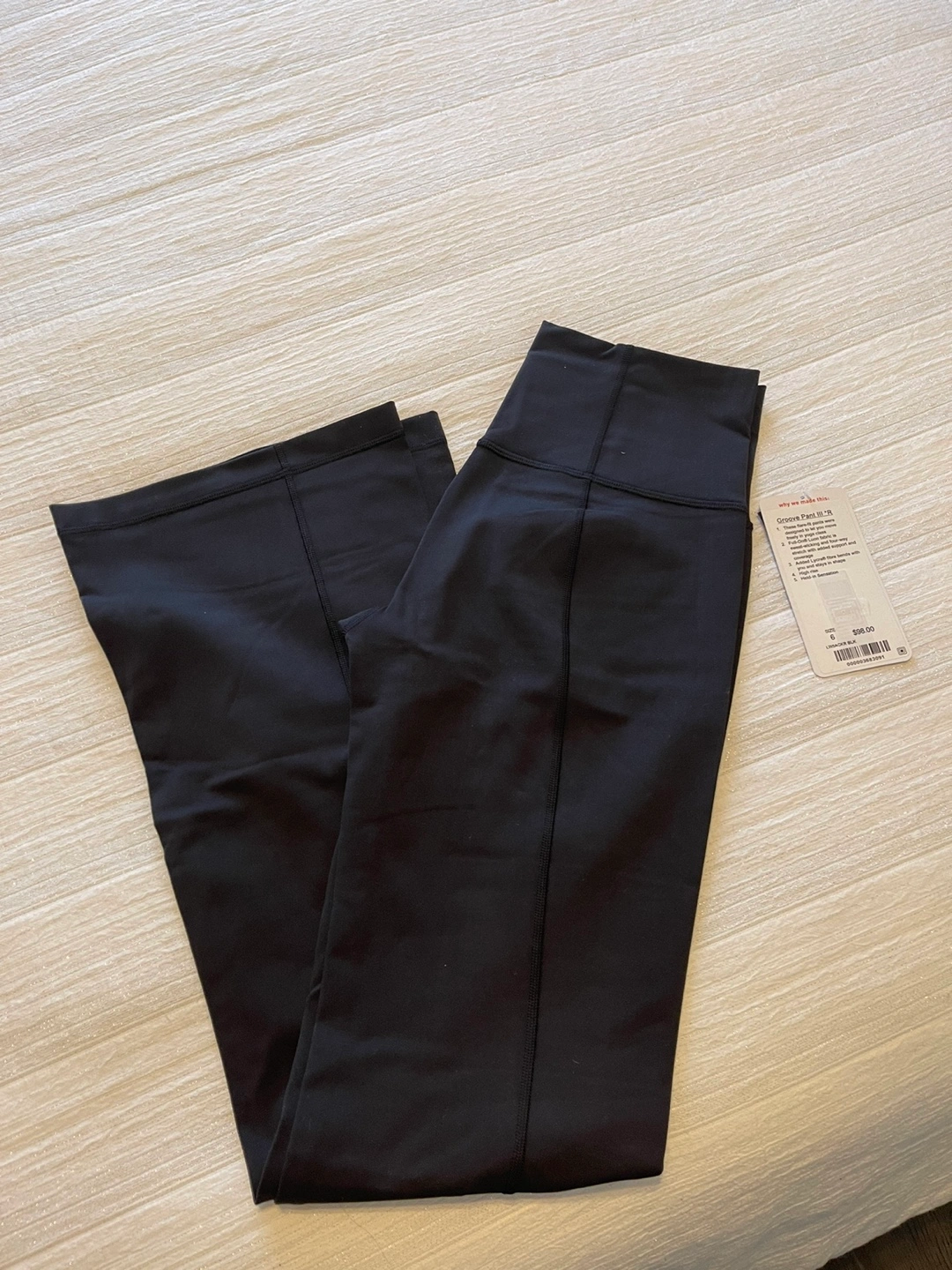Black flare-fit pants designed for yoga class. High rise, sweat-wicking fabric and four-way stretch with added support and coverage. Added Lycra® fibre beads with performance that stays in shape.