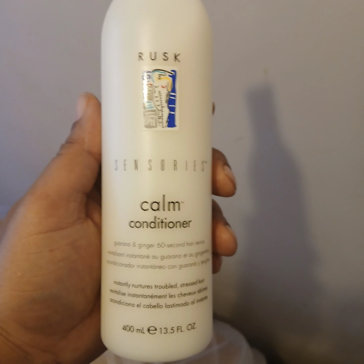 Selling a bottle of RUSK Sensors Calm Conditioner. It contains guarano and ginger for 60-second hair revive. It instantly nurtures troubled, stressed hair