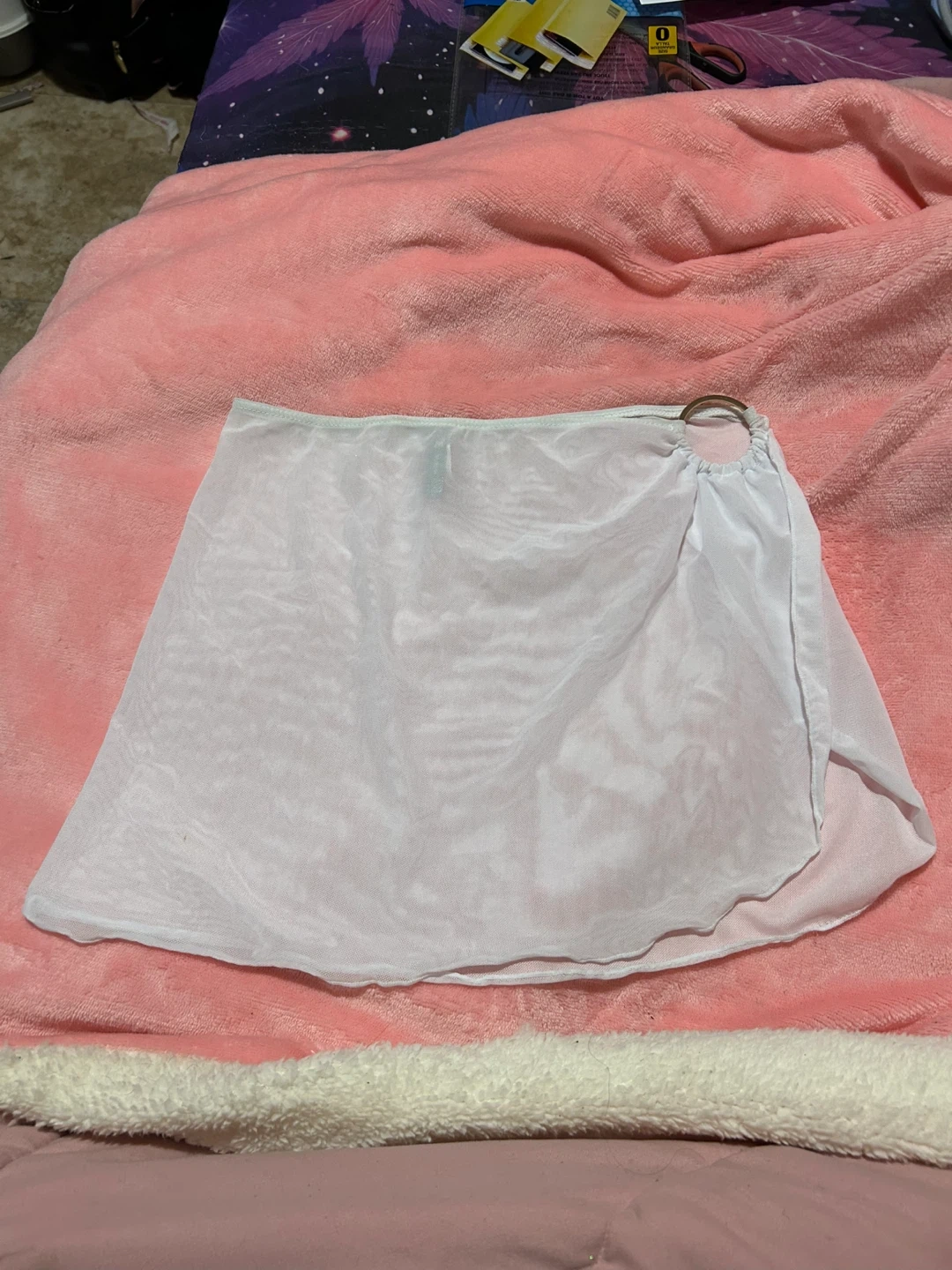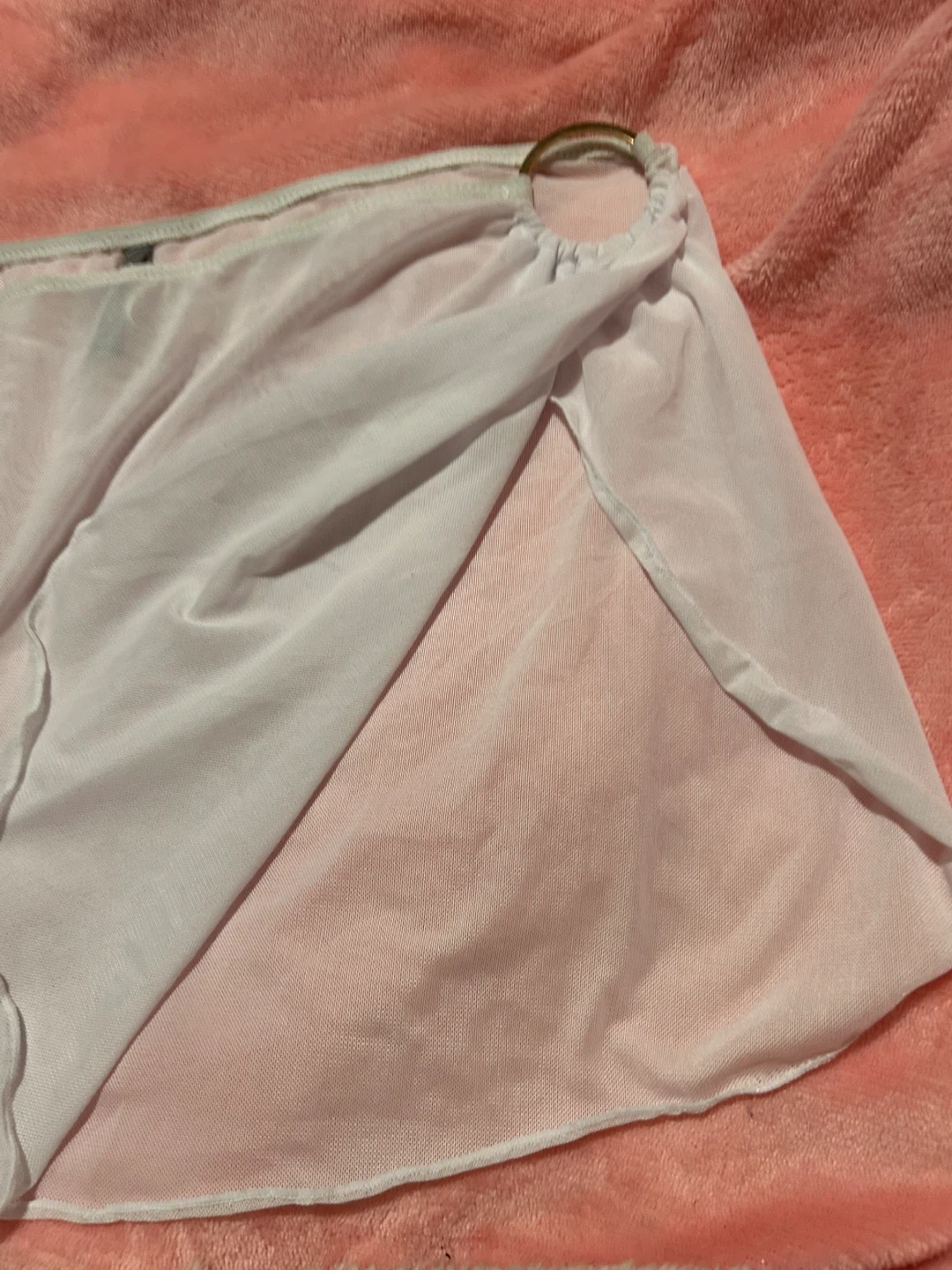 This sheer white mesh sarong skirt features a decorative ring detail. It's designed with a wrap-around style and a high slit. The material is lightweight and flowy.
