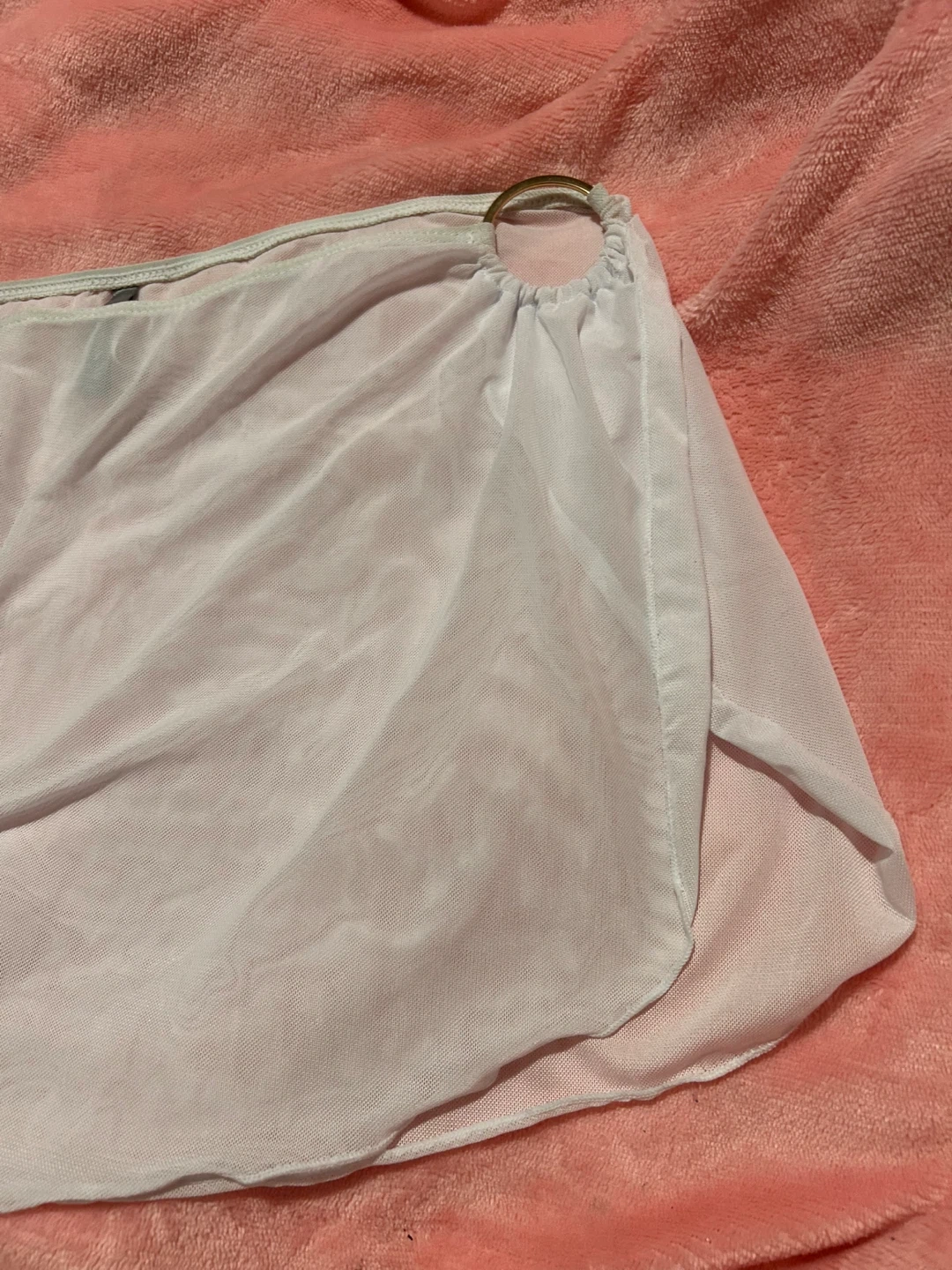 This sheer white mesh sarong skirt features a decorative ring detail. It's designed with a wrap-around style and a high slit. The material is lightweight and flowy.