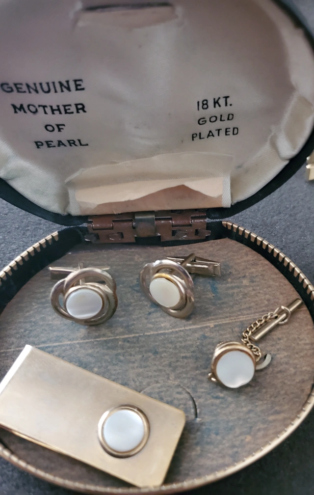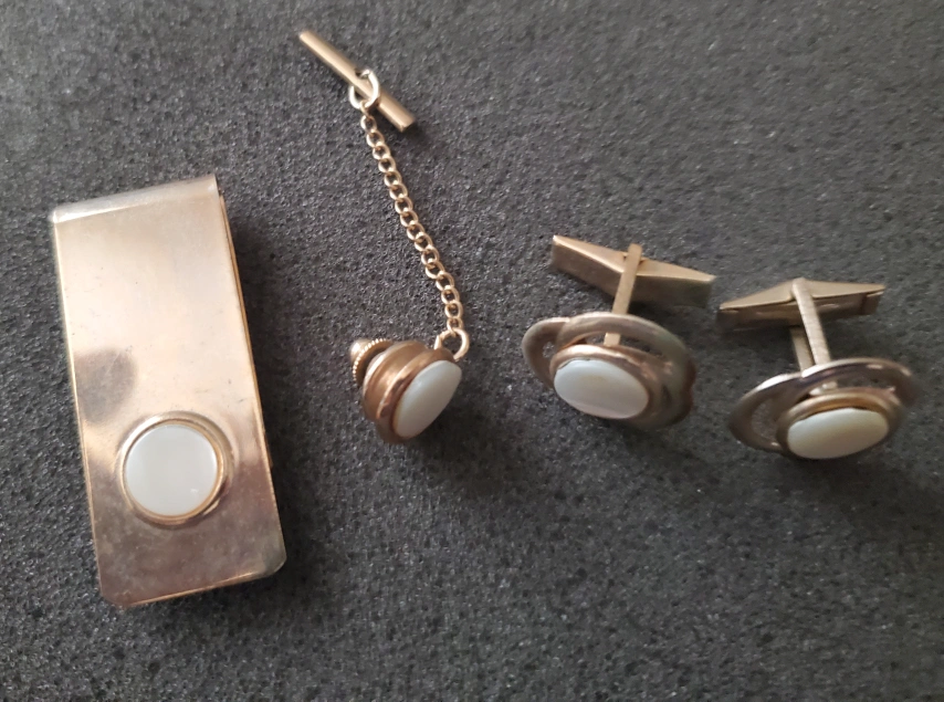 Matching set, includes cufflinks, money clip, and tie tack.