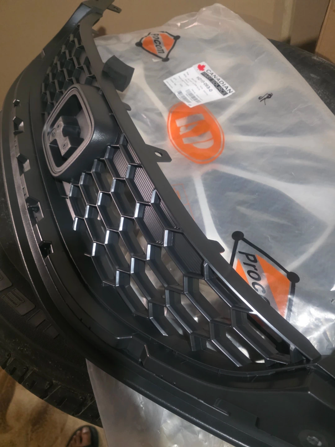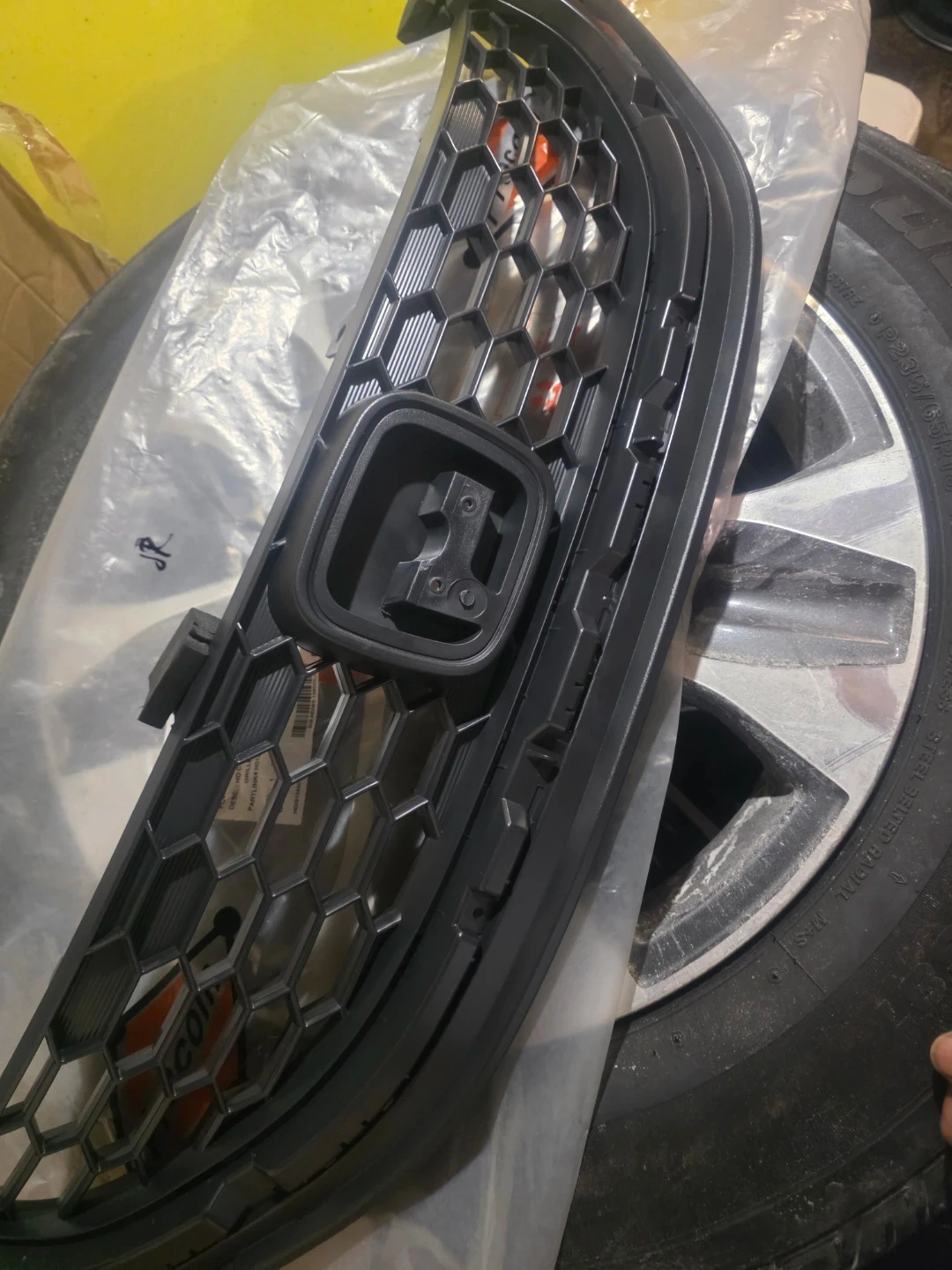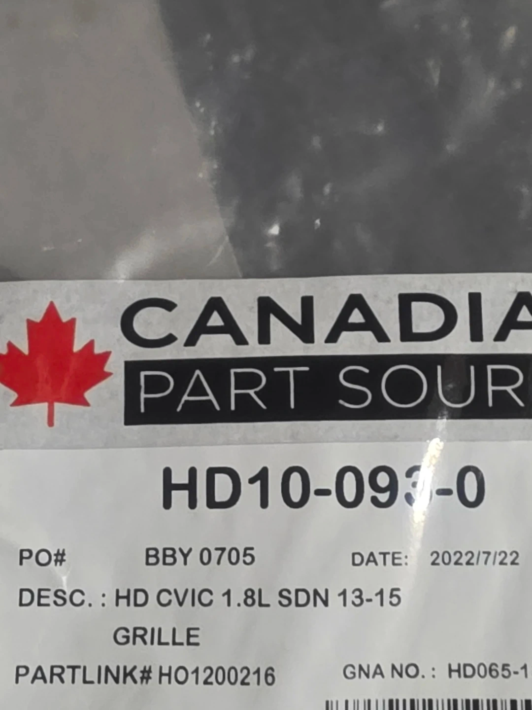Front grille for a Honda Civic 1.8L sedan. This part is designed for models from 2013 to 2015. It's a black honeycomb-style grille. Includes original packaging.