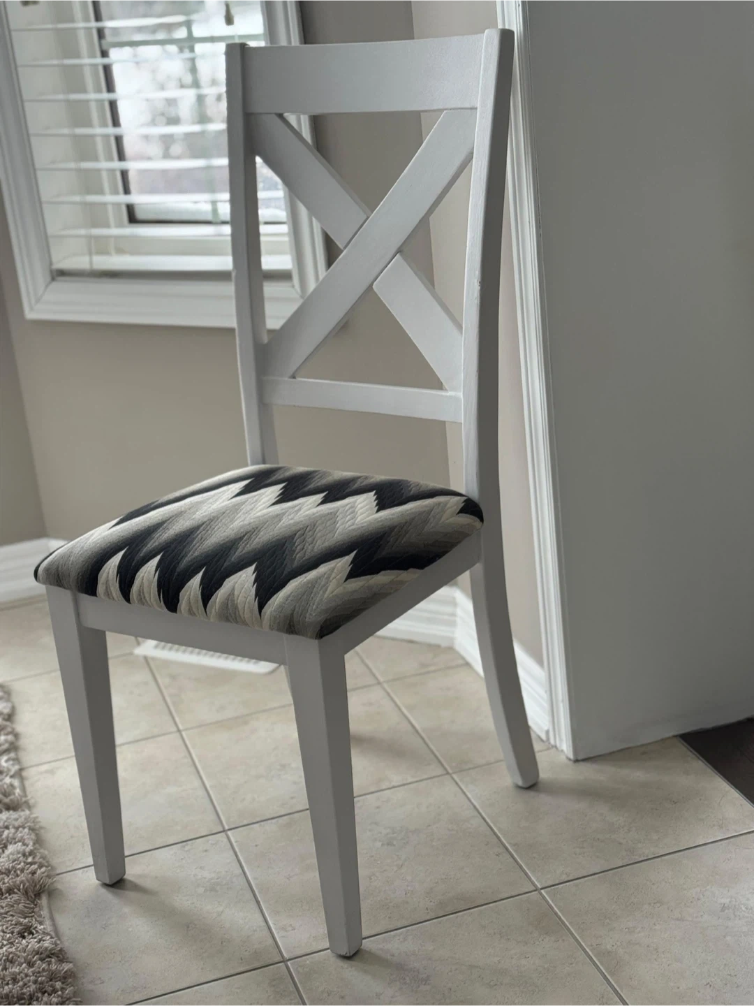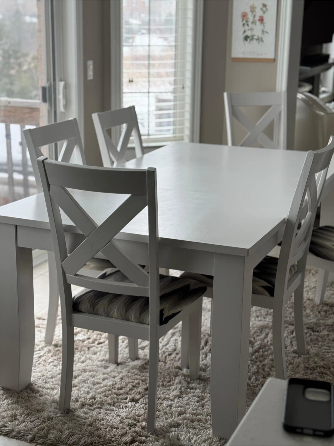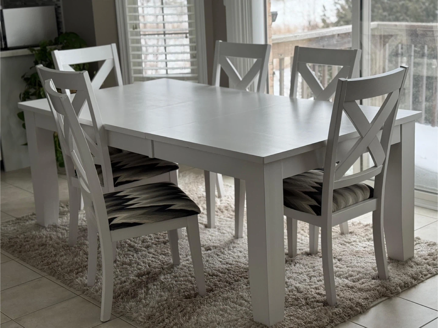 Clean white Ashley solid wood dining table with six chairs. Chairs have a modern geometric pattern on the seat. Plenty of space for family dinners. A great set for a kitchen or dining room!