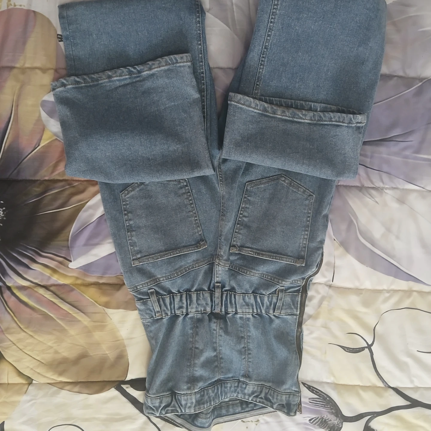 This is a light wash denim strapless jumpsuit. It features a fitted bodice with a flared leg. Elasticized waist at the back for comfort.