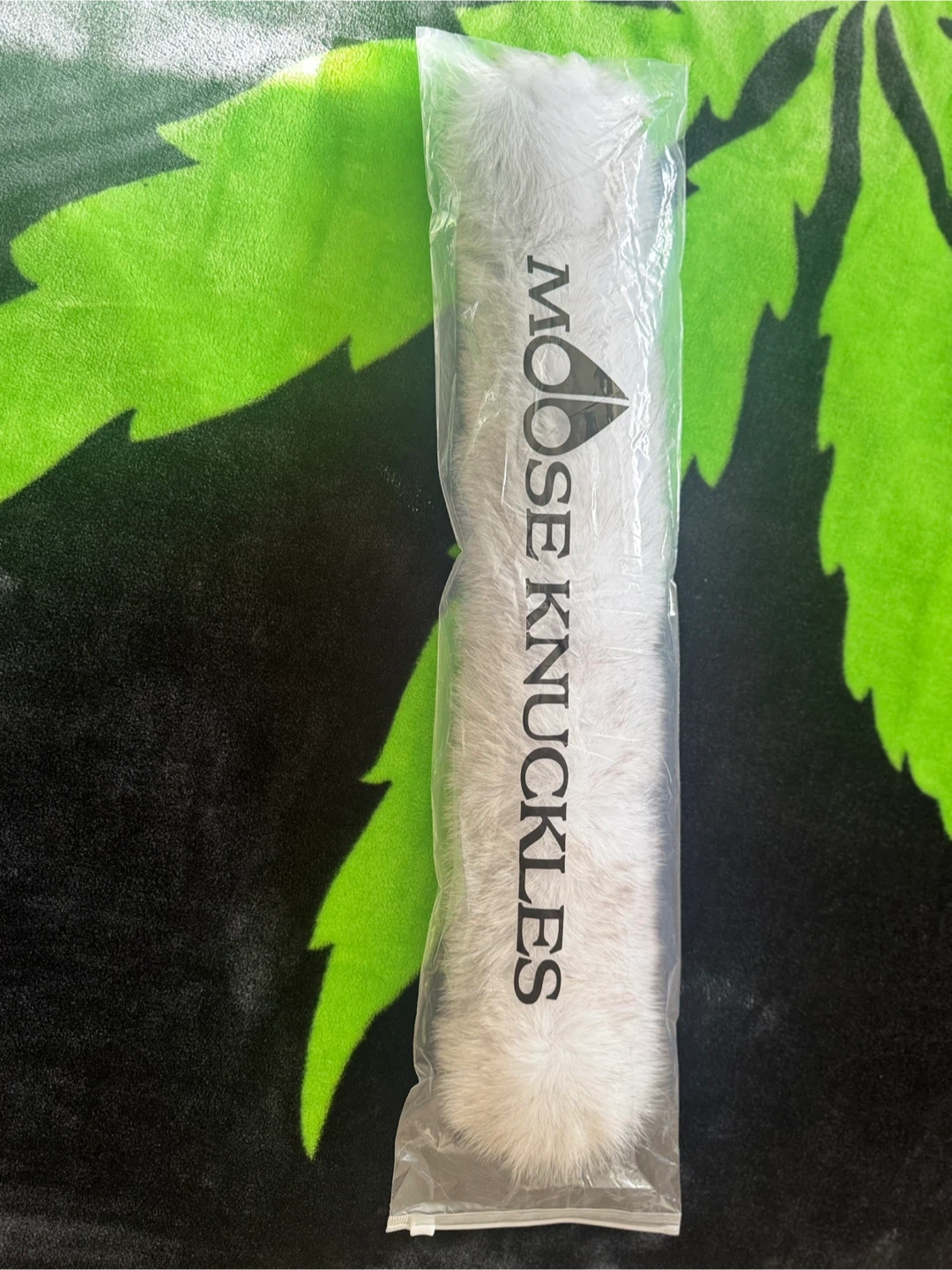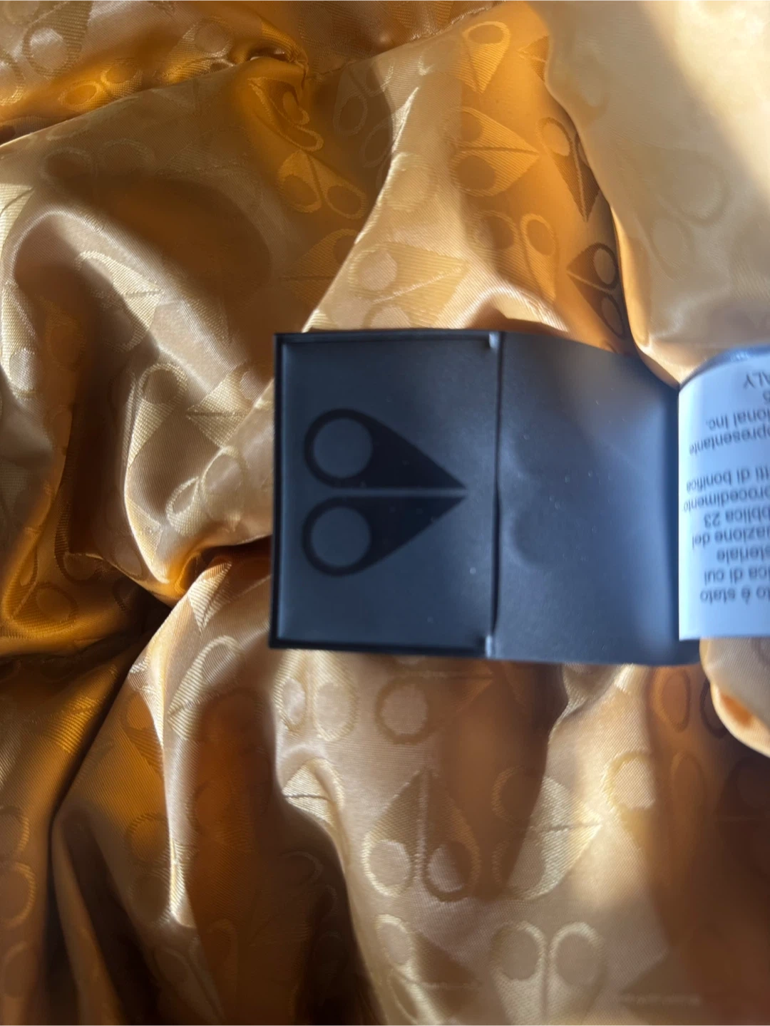 This is a black Moose Knuckles Fusion bomber jacket with a gold lining. It's a size S/P. The jacket comes with a Moose Knuckles storage bag. It features embroidered hockey players on the back.