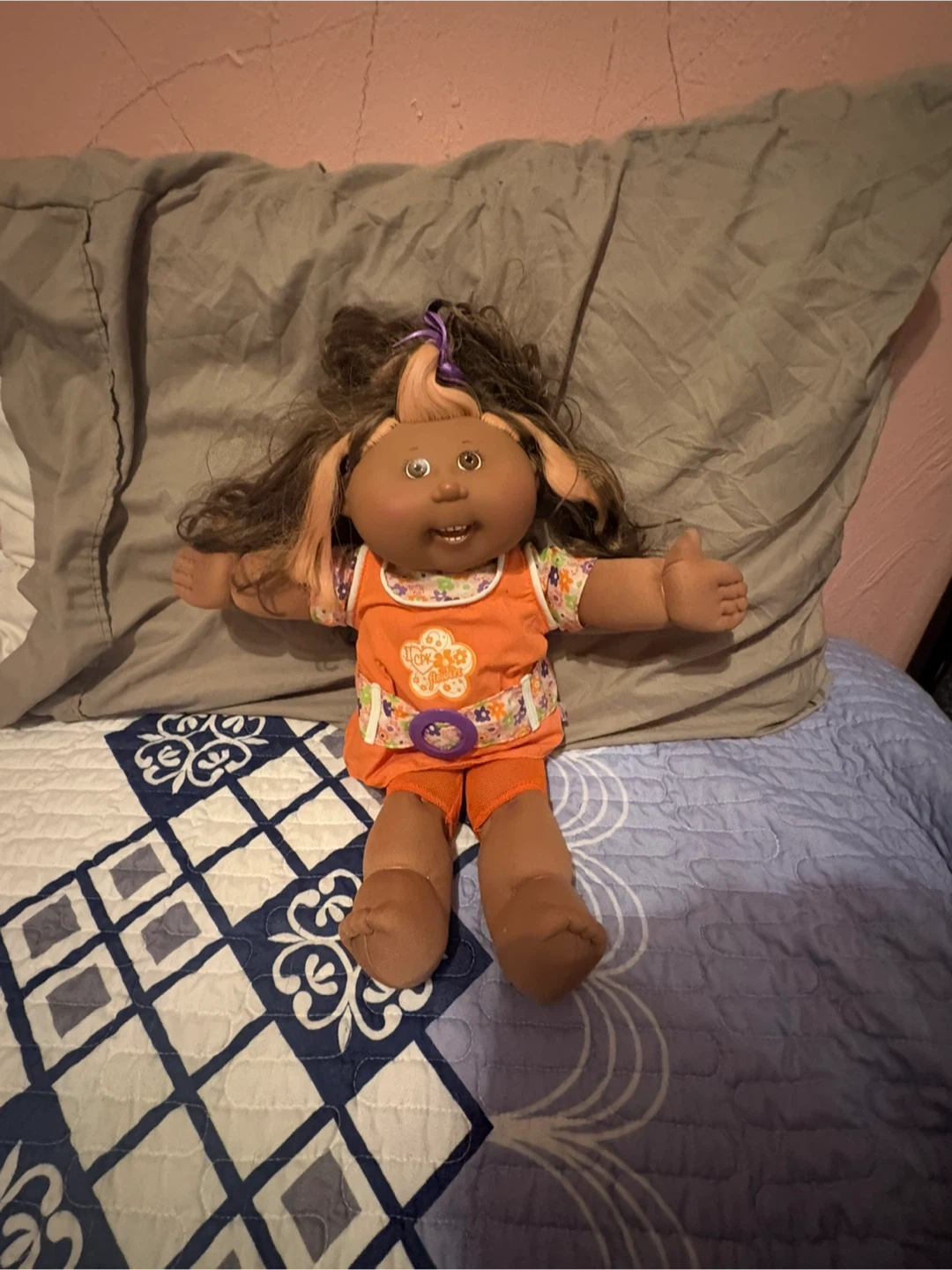 Selling a cute Cabbage Patch Kids doll! She's wearing an adorable orange outfit and has brown hair with a purple ribbon. Perfect for collectors or as a gift for a child