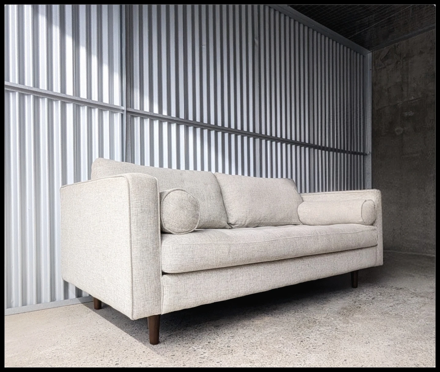 This modern take on a mid-century classic features clean lines, a tufted benchseat, and luxuriously stuffed back cushions. Two matching round bolsters complete the look