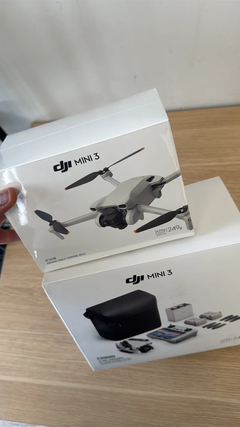 DJI Mini 3 drone. Ultra light at 249g. Comes with RC controller, 3 batteries, extra propellers, all the cables, paperwork, carrying case and 2 way battery charger.