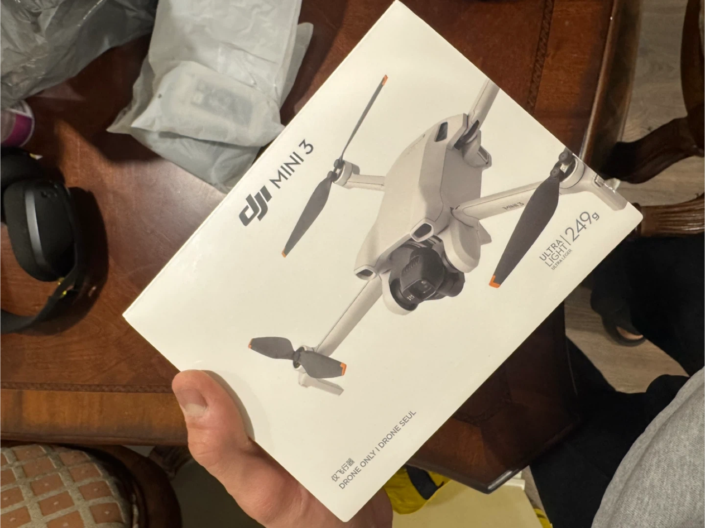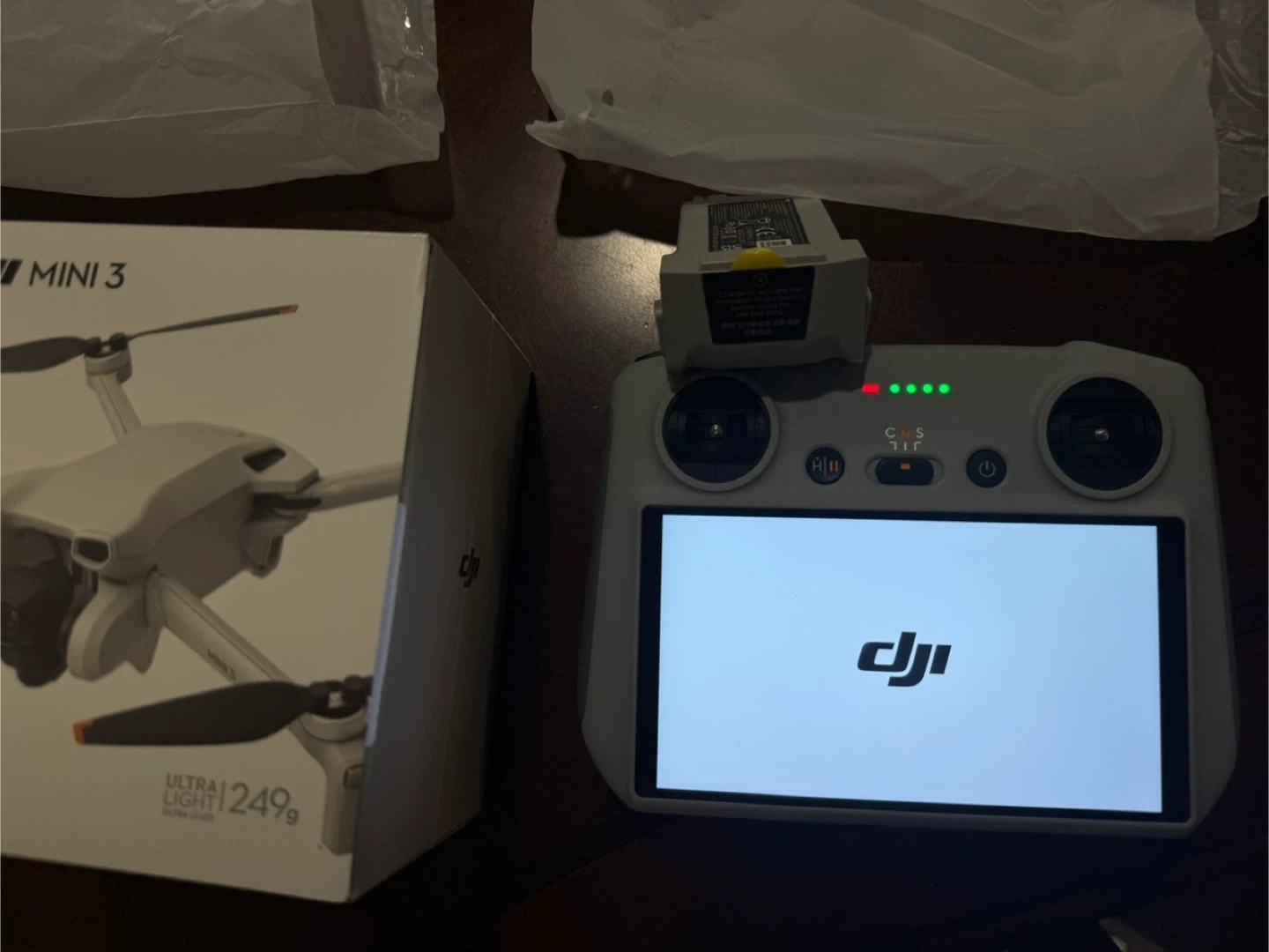 DJI Mini 3 drone. Ultra light at 249g. Comes with RC controller, 3 batteries, extra propellers, all the cables, paperwork, carrying case and 2 way battery charger.