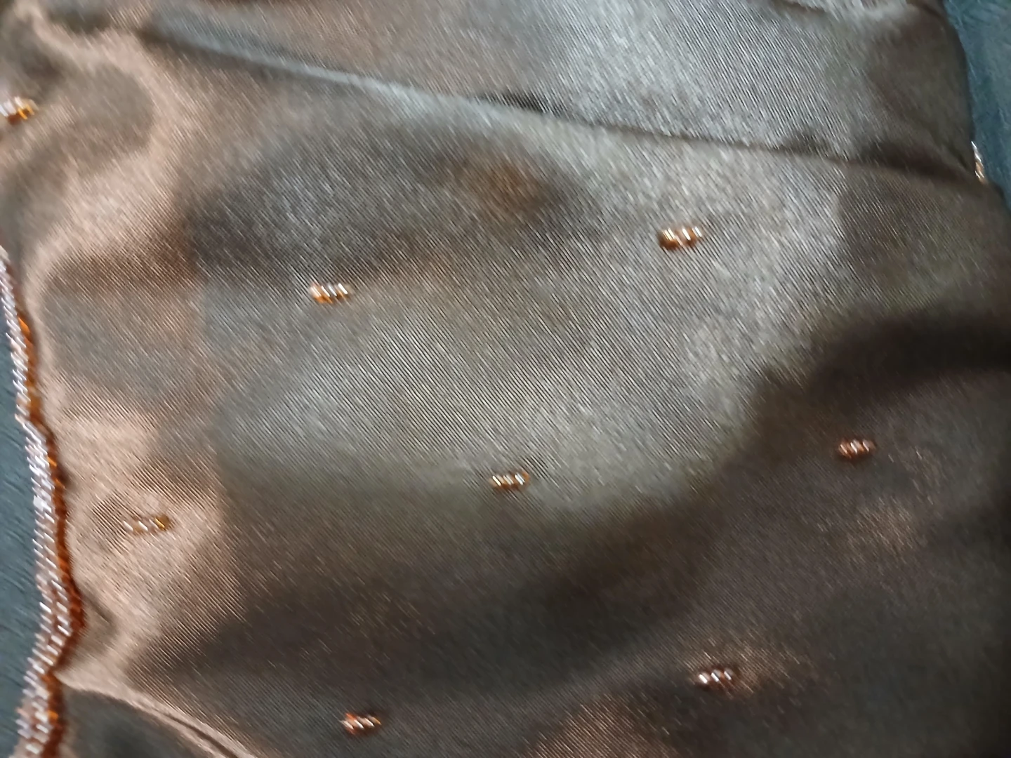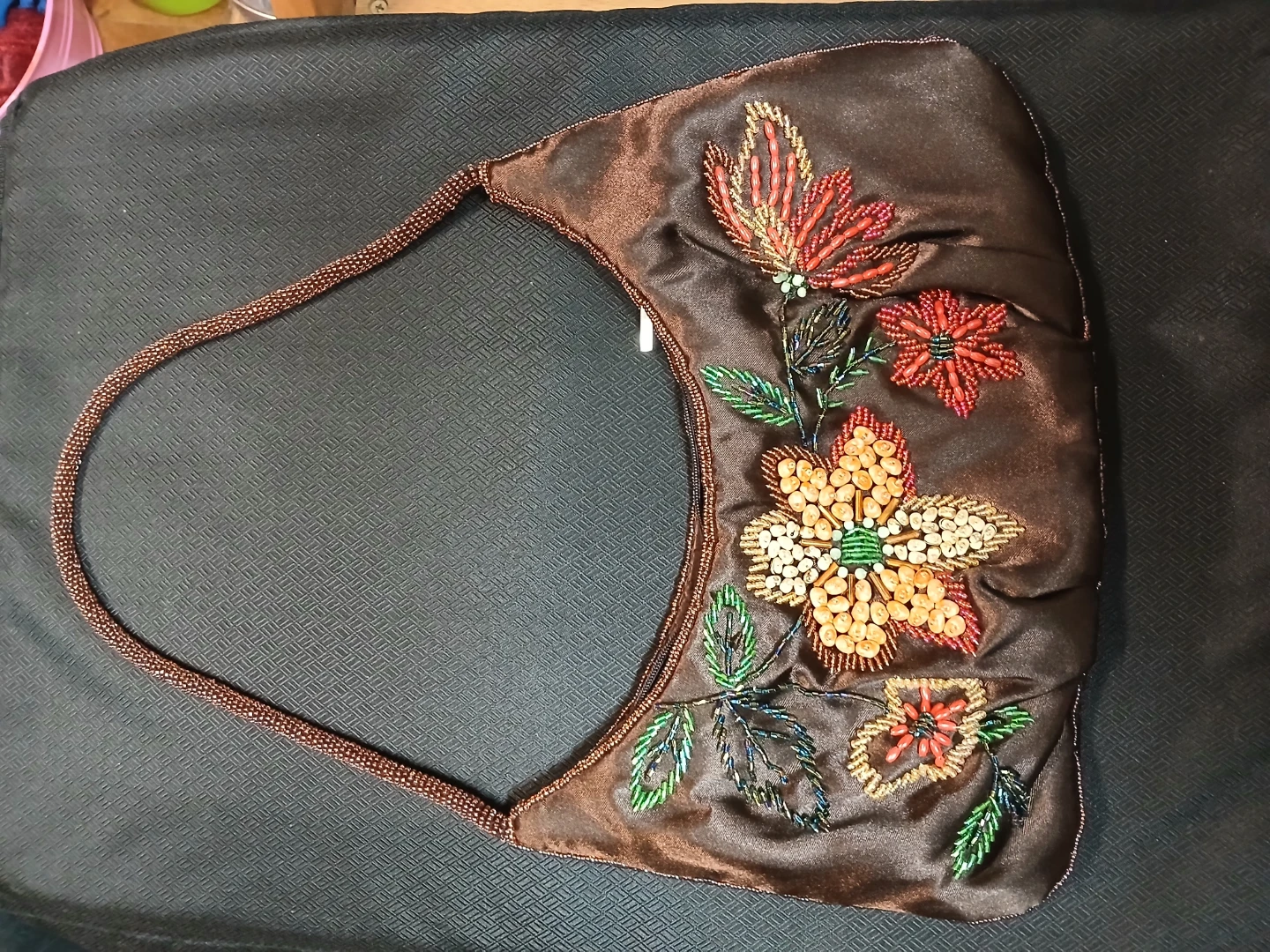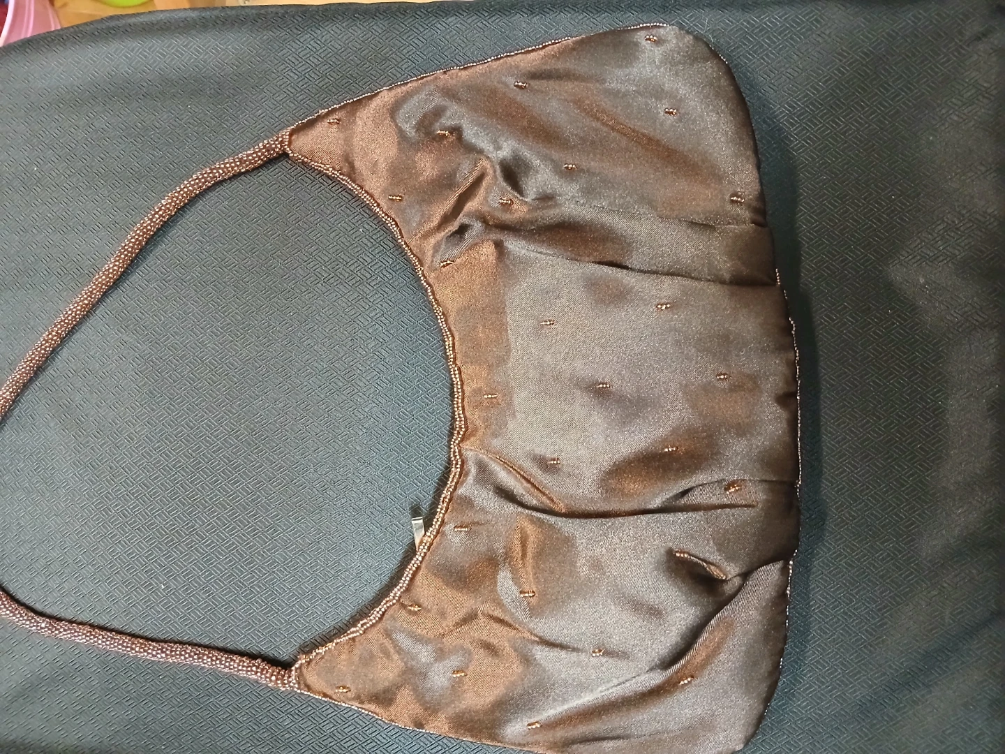 brown satin shoulder bag with beaded details! It's in great condition and perfect for adding a touch of elegance to any outfit