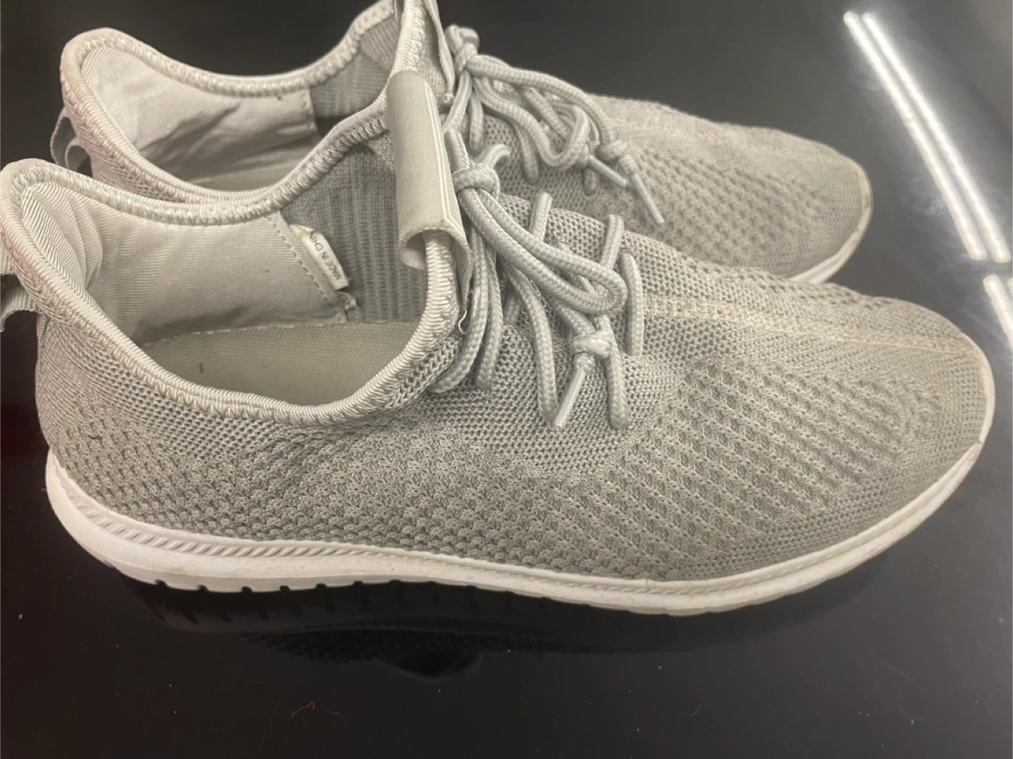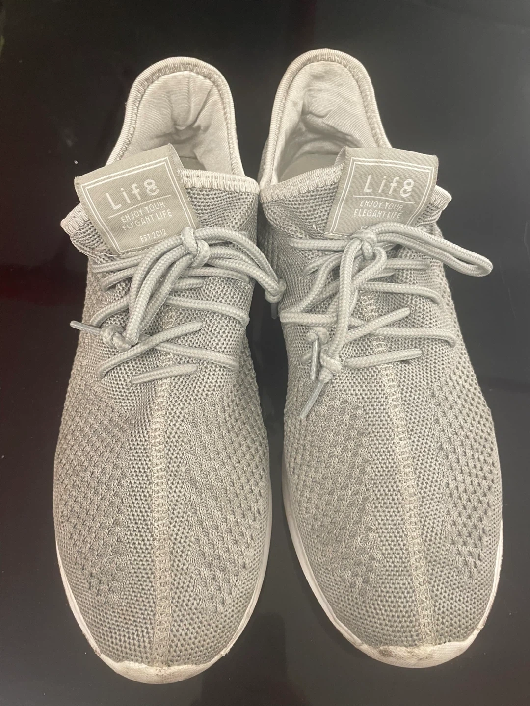 Grey knit sneakers from Life8. These shoes are made with a breathable knit upper and a flexible sole. They're designed for comfort and everyday wear. These shoes would be useful for casual outings or light athletic activities.