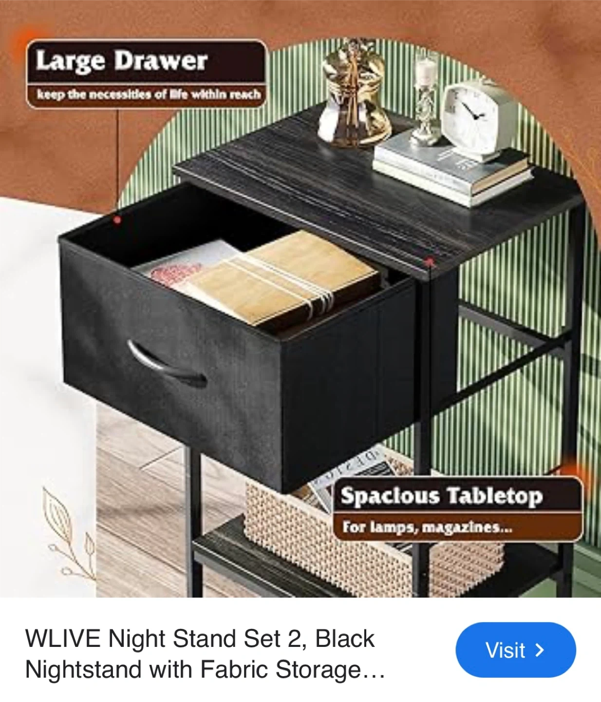 Selling a WLIVE nightstand in black! They feature a large drawer and a spacious tabletop, perfect for lamps and magazines. Great for keeping your necessities within reach, nightstand also include fabric storage.