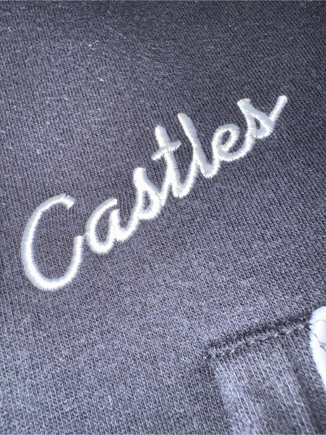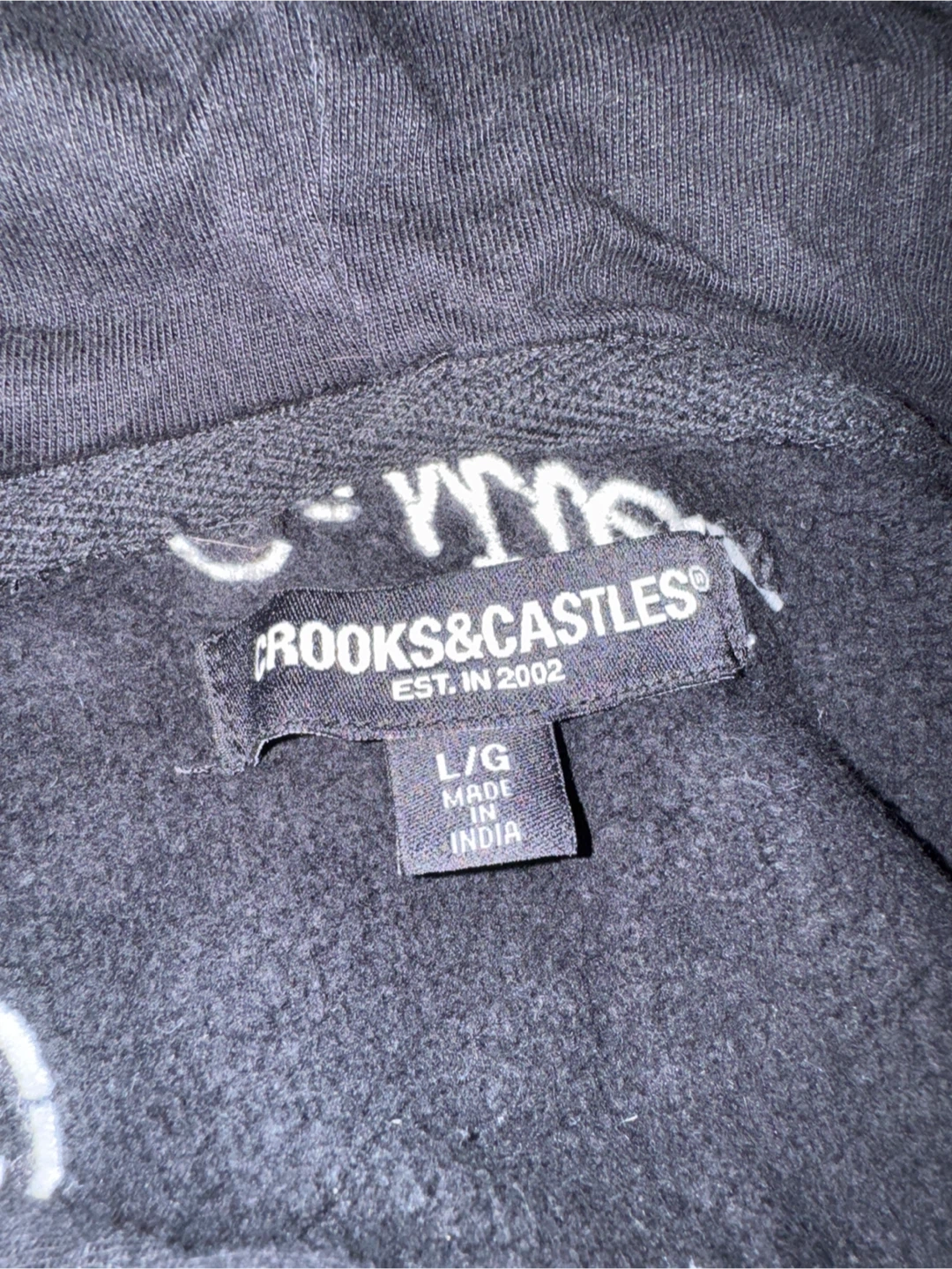 Selling a Crooks & Castles hoodie in black. It features the brand's name all over in a stylish pattern. The size is L/G.